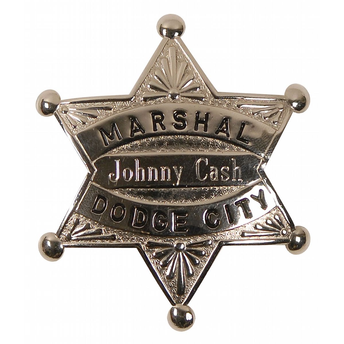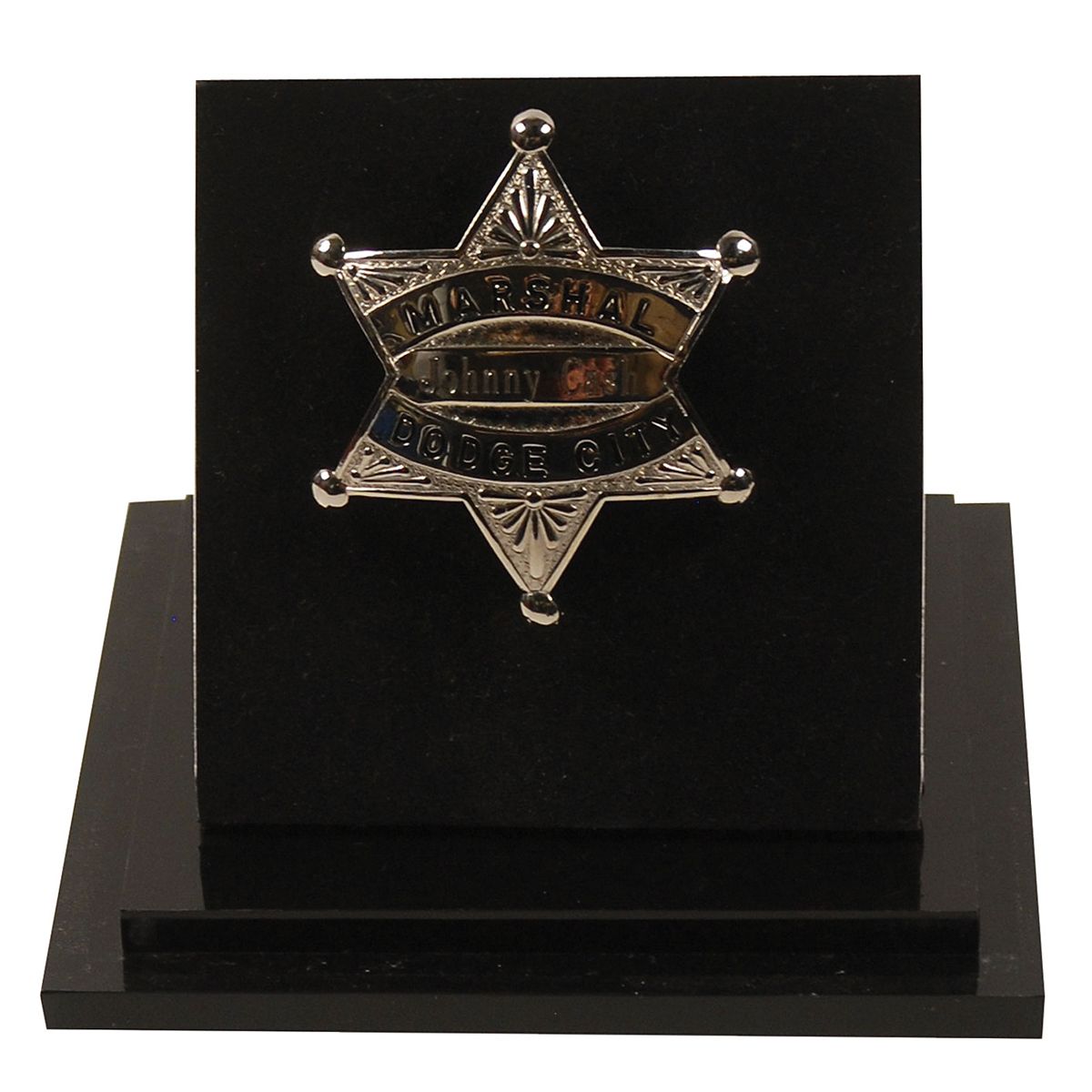 Six-pointed Dodge City Marshal's badge engraved with his name, presented to Cash during a concert tour stop in Dodge City, Kansas, on Mar. 16, 1988. In fine condition. At the same ceremony, Cash was also named an ‘honorary citizen’ of Dodge City. Incidentally, Cash was in good company, as legendary lawmen Wyatt Earp and Bat Masterson were former marshals of Dodge City. Provenance: Johnny and June Carter Cash Estate, Sotheby’s 2004.