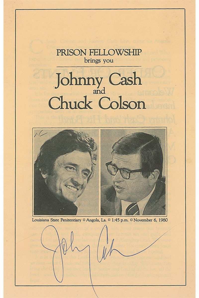 Program from Cash’s November 6, 1980, Prison Fellowship concert at Angola prison, 5.5 x 8.5, two pages, signed on the front in blue ballpoint by Cash. In fine condition. Accompanied by an original front section of the November 13, 1980, edition of the St. Francisville Democrat, featuring an image of Cash performing on the front page.