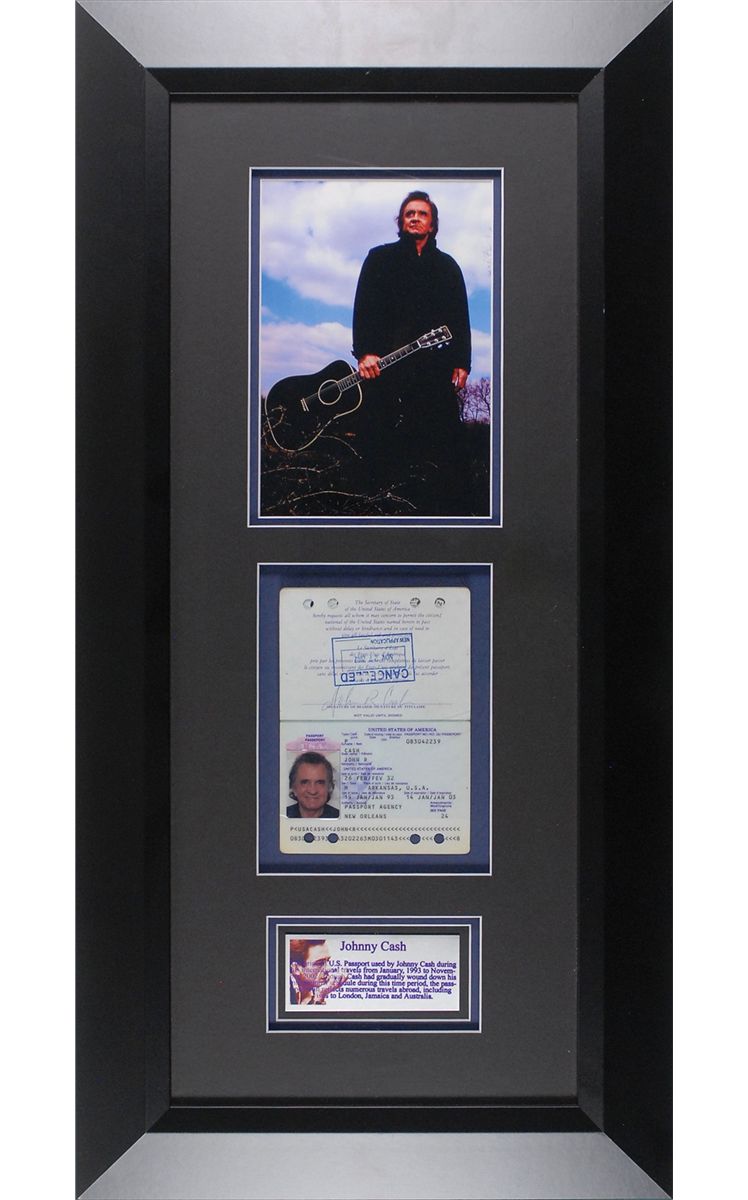 Cash’s personal passport, number 083042239, issued on January 15, 1993. Passport measures 3.5 x 5, and contains typed personal information on the inside front cover, including his place and date of birth, and the issuing office location of New Orleans. Affixed to the page is Cash’s color 1.5 x 1.75 passport snapshot, and signed on the adjacent page in ballpoint, “John R. Cash,” with the page also bearing a November 27, 2002, cancellation stamp. Passport is matted and framed with a full-length color portrait and an informational plaque stating the document “still reflects numerous travels abroad, including visits to London, Jamaica and Australia,” to an overall size of 15.5 x 31. In fine condition, with expected punch holes and slight wear from use. Around this time Cash was enjoying a period of rejuvenation that saw him bring introduced to new audiences. He won a Grammy award for Best Contemporary Folk Album in 1994, and was well-received at the 1994 Glastonbury Festival, which he called one of the highlights of his career. He also achieved exposure for notable television appearances, including lending his voice to The Simpsons. His travel was heavily curtailed in 1997 after being diagnosed with Shy-Drager syndrome. An important item called upon frequently during Cash’s swan song.