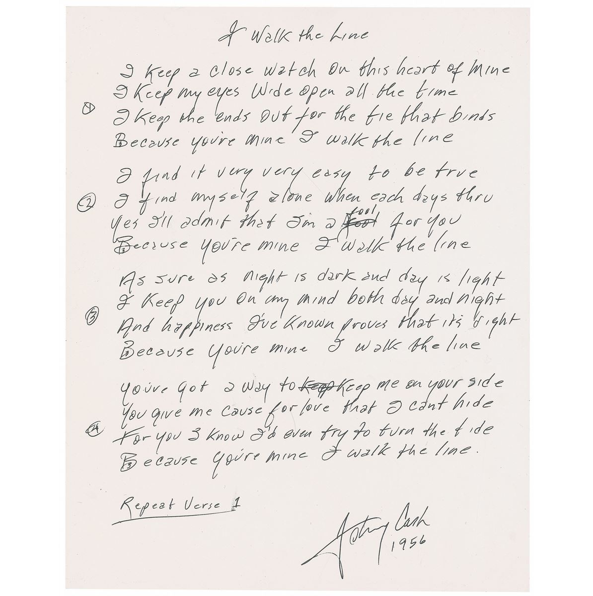 Handwritten lyrics to Cash’s hit song ‘I Walk the Line’ on a white 9 x 11.25 sheet, signed at the conclusion in black ink, “Johnny Cash, 1956.” Cash pens four verses from the song, in part: “I keep a close watch on this heart of mine / I keep my eyes wide open all the time / I keep the ends out for the tie that binds / Because you're mine, I walk the line / I find it very easy to be true / I find myself alone when each days thru / Yes I’ll admit that I’m a fool for you / Because you’re mine I walk the line.” Cash makes a pair of corrections, and adds “Repeat Verse 1” at the conclusion. In fine condition, with a spot of trivial brushing. Written by Cash for his first wife Vivian Liberto while he was stationed as an Air Force radio operator in Germany, ‘I Walk the Line’ was recorded in 1956 and became Cash’s first number one Billboard hit, remaining on the record charts for over 43 weeks and selling over two million copies. A wonderful, complete lyric sheet, crisply penned by the man in black in the year of its release.