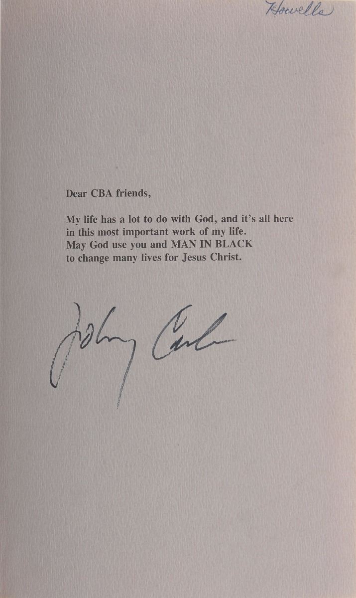 Signed book: Man in Black. First edition. Grand Rapids, Michigan: Zondervan, 1975. Hardcover with dust jacket, 5.75 x 8.75, 244 pages. Signed on an opening page in black ink by Cash. In fine condition.