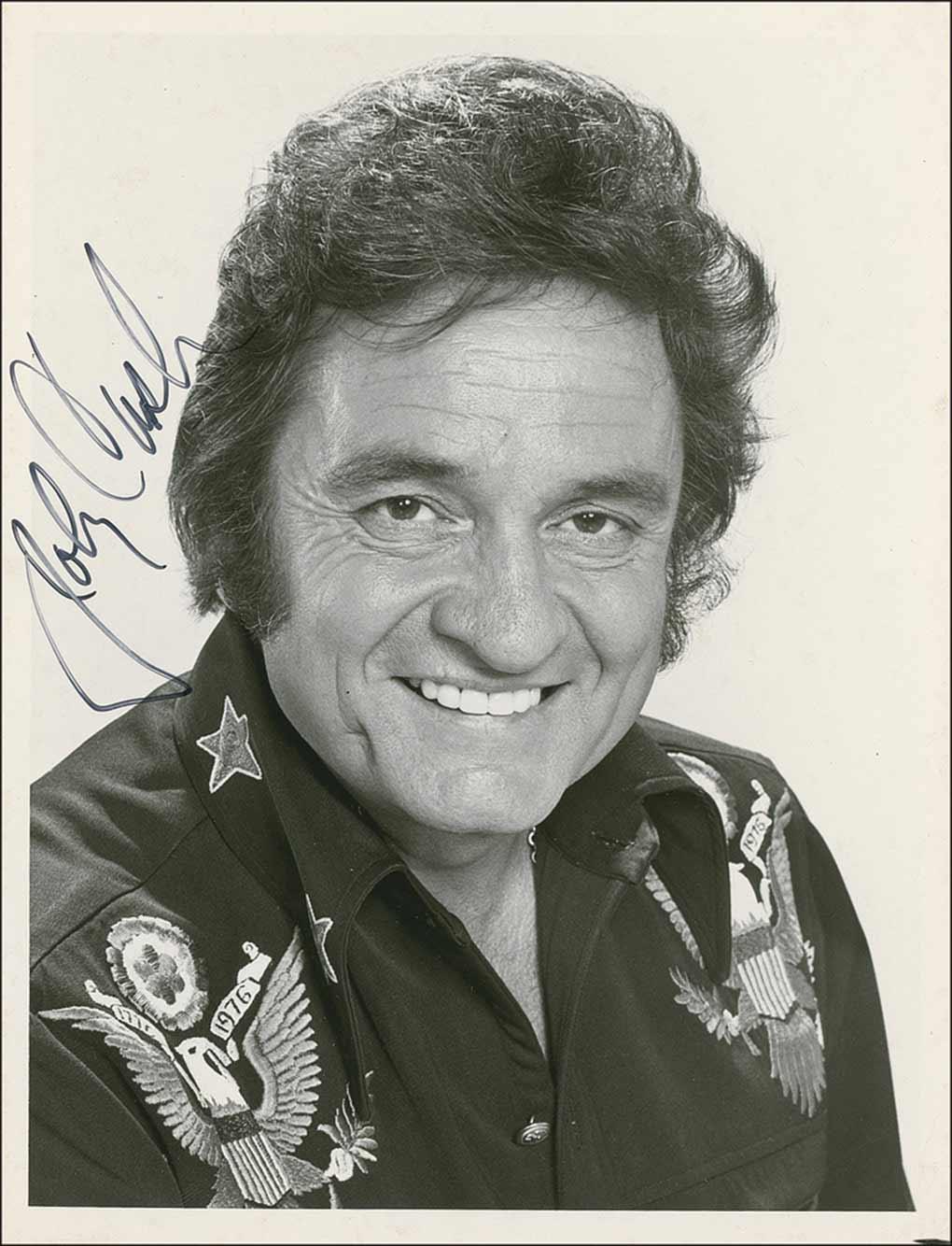 Glossy 7 x 9.25 photo of Cash in a patriotic shirt, signed in black felt tip. In fine condition, with light crease to lower right corner, and a couple small edge creases.