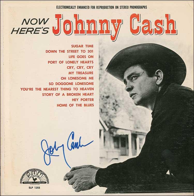 Now Here’s Johnny Cash album signed on the front cover in blue felt tip. In fine condition, with a couple corner dings, and a mild overall shade of toning to cover. The record is not included. RRAuction COA.