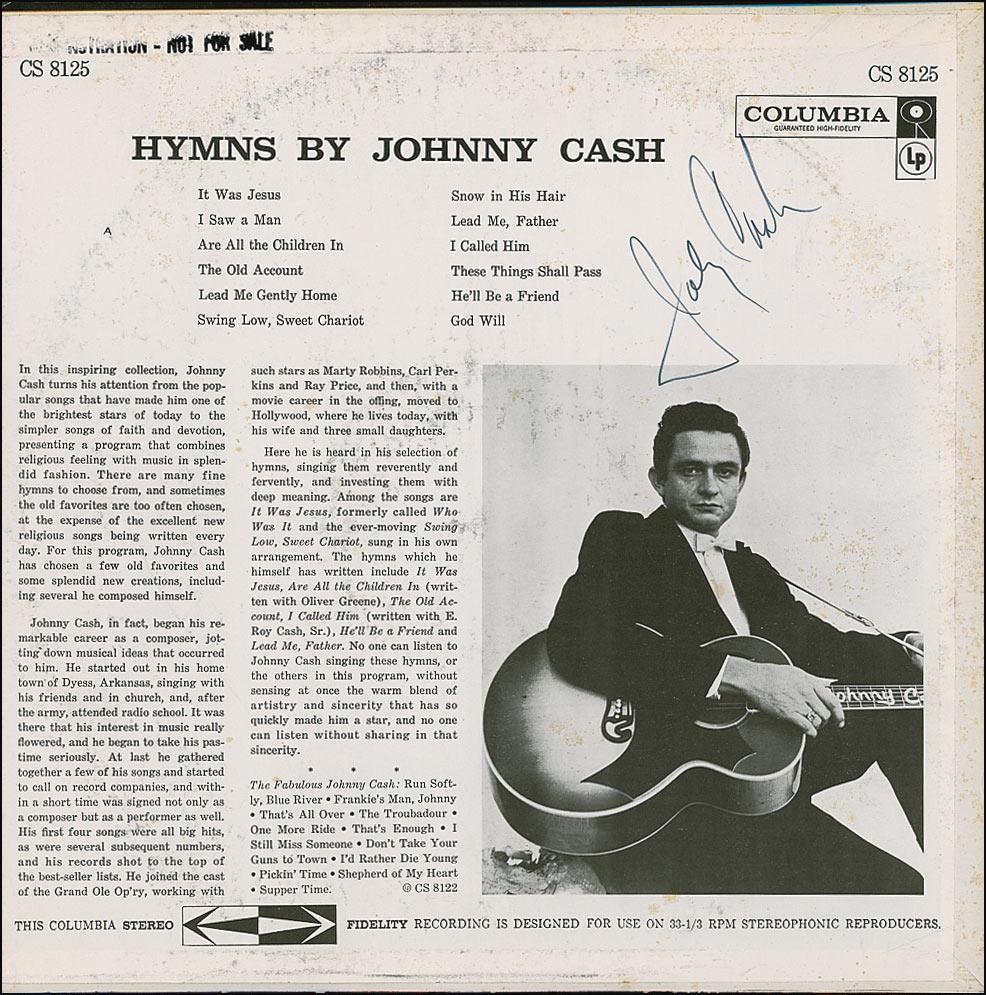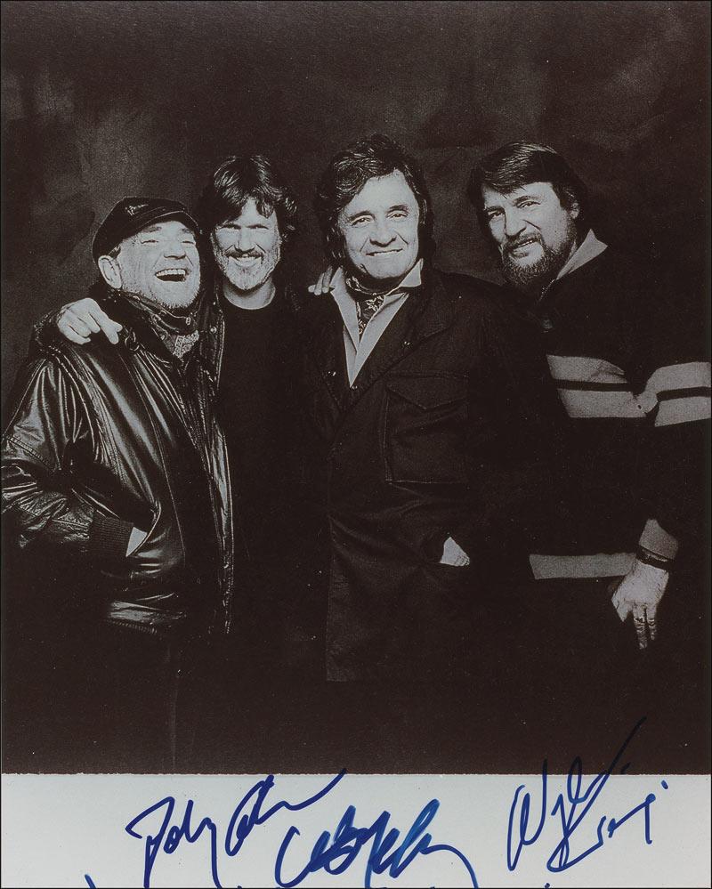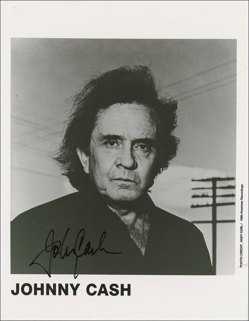 Three items: satin finish 8 x 10.25 portrait of a pensive-looking Cash, signed in black felt tip; 8 x 10 glossy group photo signed in blue felt tip by Cash, Willie Nelson, and Waylon Jennings; and a Hymns by Johnny Cash album signed on the back cover in black felt tip by Cash. The record in included. In overall fine condition, with some light scuffing to the back of the album.