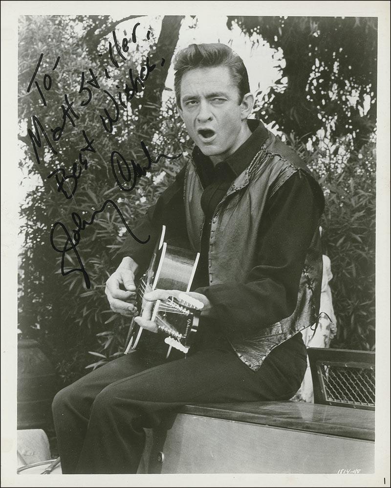 Glossy 8 x 10 publicity photo of Cash singing, signed and inscribed in black felt tip “To – Matt Stiller, Best wishes, Johnny Cash.” In fine condition, with a few light surface marks.