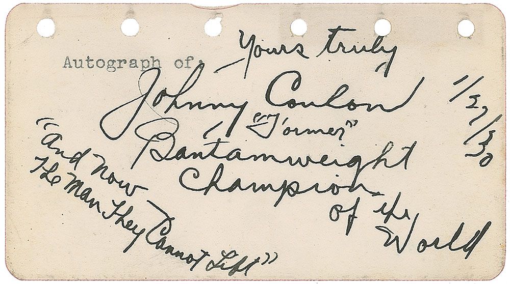 Boxer (1889–1973) who was bantamweight champion of the world from 1910 to 1914. Upon retiring, the diminutive man had a stage act where he challenged people to pick him up—and no one succeeded. Coulon’s trick was to feign a struggle and press a nerve on his opponent’s neck, rendering them unable to lift him. Vintage ink signature, “Yours truly, Johnny Coulon, ‘Former’ Bantamweight Champion of the World, ‘And now the man they cannot lift,’ 1/27/30,” on an off-white 4.5 x 2.5 page. In fine condition.
