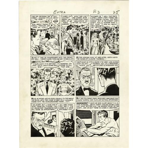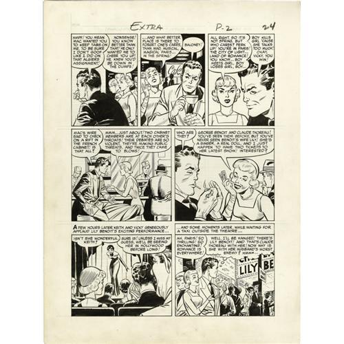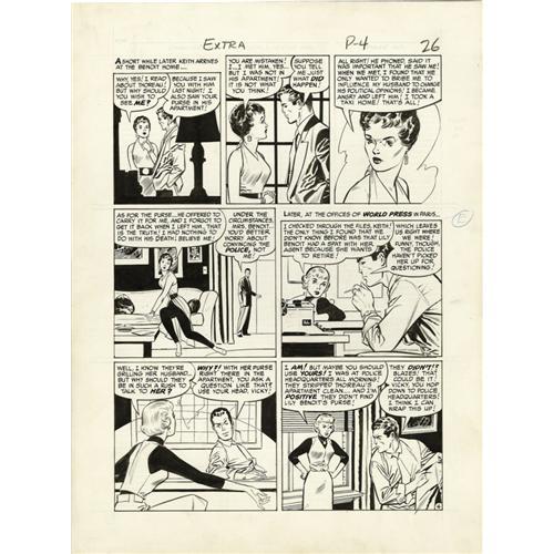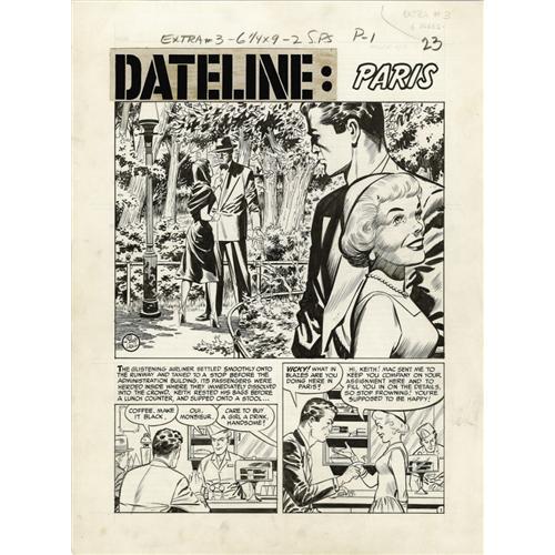<B>Johnny Craig - Extra #3 Complete 6-page Story "Dateline: Paris" Original Art (EC, 1955).</B></I> Johnny Craig's dramatic storytelling and crisp inking for <B>Extra</B></I> rivaled the slick illustrative cartooning of adventure comic strip masters such as Milton Caniff, Stan Drake, and John Cullen Murphy. In an interview, Johnny Craig told comics historian Roger Hill, "I greatly enjoyed <B>Extra</B></I>. At the time, it was the most fascinating kind of story I could have wanted to do, precisely what I loved to do. I liked it because it was a clean kind of book, and it had many advantages for me as an editor. It had an engaging character with whom I could get acquainted, consider a friend and get to know -- someone whom I could develop and build on. It gave me the chance to take him anywhere in the world and do any kind of story that I felt like writing. I could bring in characters, take them out, and, in general, had unlimited freedom. It was great." As an "art bonus," four of these pages have Johnny Craig pencil sketches on their backs. The image area of each page measures 8.75" x 12", and the art is in Excellent condition.