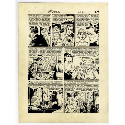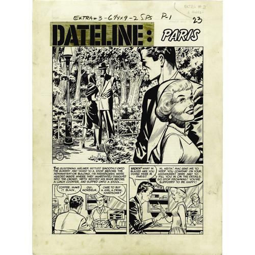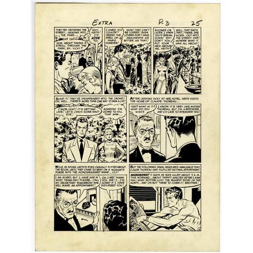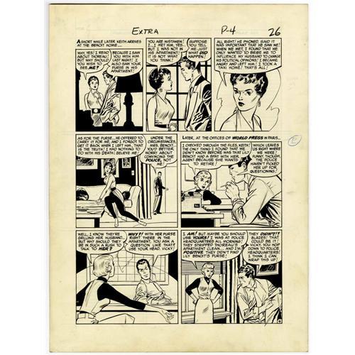 <B>Johnny Craig - Extra #3, Complete 6-page Story "Dateline: Paris" Original Art (EC, 1955).</B></I> Johnny Craig's dramatic storytelling and crisp inking for <B>Extra</B></I> rivaled the slick illustrative cartooning of adventure comic strip masters such as Milton Caniff, Stan Drake, and John Cullen Murphy. In an interview, Johnny Craig told comics historian Roger Hill, "I greatly enjoyed <B>Extra</B></I>. At the time, it was the most fascinating kind of story I could have wanted to do, precisely what I loved to do. I liked it because it was a clean kind of book, and it had many advantages for me as an editor. It had an engaging character with whom I could get acquainted, consider a friend and get to know -- someone whom I could develop and build on. It gave me the chance to take him anywhere in the world and do any kind of story that I felt like writing. I could bring in characters, take them out, and, in general, had unlimited freedom. It was great." As an "art bonus," four of these pages have Johnny Craig pencil sketches on their backs. The image area of each page measures 8.75" x 12", and the art is in Excellent condition.<BR><BR><b>Shipping:</b> Flat Material, Small (<a target="_blank" href="http://www.heritageauctions.com/common/shipping.php">view shipping information</a>)