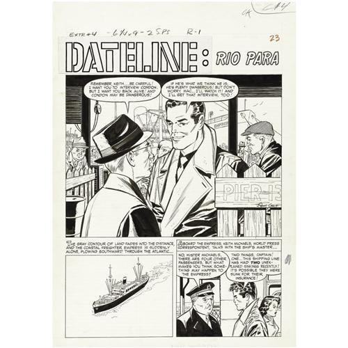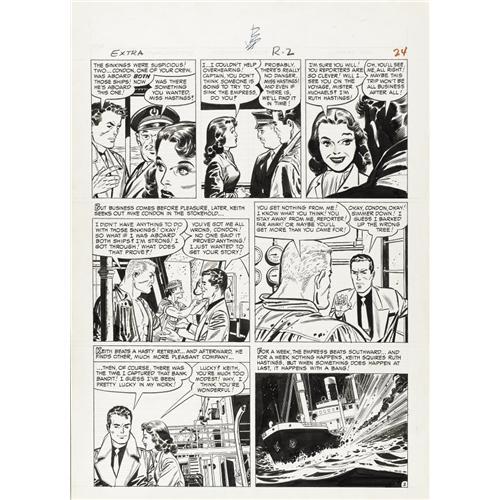 <B>Johnny Craig - Extra #4, Complete 6-page Story "Dateline: Rio Para" Original Art (EC, 1955).</B></I> Johnny Craig's clean, handsome art shines in this two-fisted adventure that served as the cover story for <B>Extra</B></I> #4. Mystery novelist and comics writer Max Allan Collins has termed this story "one of the best of the six-page 'Datelines,'" and noted that "Craig does very well with this variation on Hitchcock's 'Lifeboat,' the sequences at sea being extremely effective and again has the courage to have his protagonist fail." As an "art bonus," four of the pages have Johnny Craig pencil sketches on their backs. The image area of each page measures 13" x 16", and the art is in Excellent condition.<BR><BR><b>Shipping:</b> Flat Material, Large (<a target="_blank" href="http://www.heritageauctions.com/common/shipping.php">view shipping information</a>)