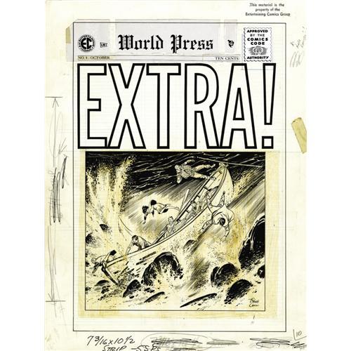 <B>Johnny Craig - Extra #4 Cover Original Art (EC, 1955).</B></I> "If it bleeds, it leads" -- so goes a tried-and-true news media adage. Johnny Craig's sea-swept cover for <B>Extra</B></I> #4 captures the all-out thrills found on newspaper reporters' beats! Craig was a master at combining cartooning and illustrative techniques. His streamlined art was ideally suited for the <B>Extra</B></I> stories and covers. The image area of this cover measures 9" x 13". There is a glue stain covering the main image; otherwise, the art is in Very Good condition.