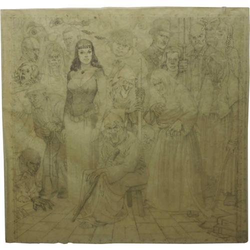 <B>Johnny Craig - "Group Portrait" EC Horror Host Pencil Preliminary Illustration Original Art (1991).</B></I> Johnny Craig is reknowned for his meticulous working habits. In the eighties and nineties, EC fan-addicts started commissioning Craig to paint new scenes of the EC horror hosts, especially the Vault Keeper and Drusilla. For his canvas, "Group Portrait," Craig drew a detailed pencil rendering of his composition on vellum, at the same size that the painting was planned to be. This large layout has all of the detail of the finished painting, and was Craig's final design step before putting the image on canvas as a painting. Craig's consummate craftsmanship really shines in this study, and it has an image area of 30" x 30". Aside from being rolled, and having a few stress creases, the art is in Very Good condition.