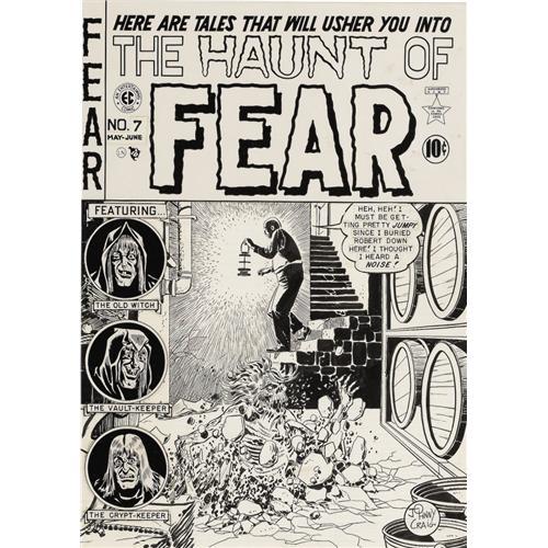 <B>Johnny Craig - Haunt of Fear #7 Cover Original Art (EC, 1951).</B></I> Rotting corpses that dig their way out of a grave to exact a gruesome and ironic revenge became a hallmark of the EC horror line. However, a simple festering corpse isn't quite enough for true EC horror fan-addicts. Johnny Craig once outlined his approach to setting the proper horror mood -- "Fear is horror too. Suspense, many things can be considered horror." The image area of this tense cover scene measures 13.5" x 19". The title logo and the portraits of the horror hosts are stats. The art is in Excellent condition.