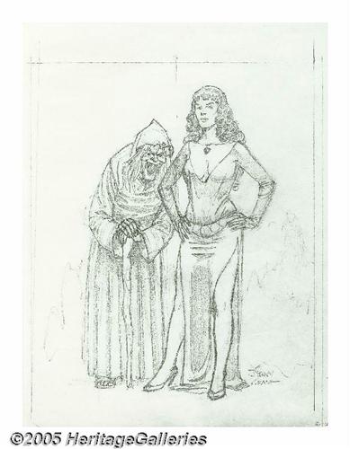 <B>Johnny Craig - Vault Keeper and Drusilla Sketch Original Art (undated).</B></I> Johnny Craig has penciled a spectacular double-portrait of that gruesome twosome, the Vault Keeper and his comely assistant, Drusilla. Craig's careful working methods and attention to detail are legendary in the comics field, and his artistry is at its peak form in this drawing. Fasten your drool cups, EC fan-addicts, as Drusilla puts on a bit of a leg show. The image area of this gem is 8" x 10", it's in Excellent condition, and Johnny Craig signed it at the lower right. C'mon and put your bid in on the horror hosts we love the most!