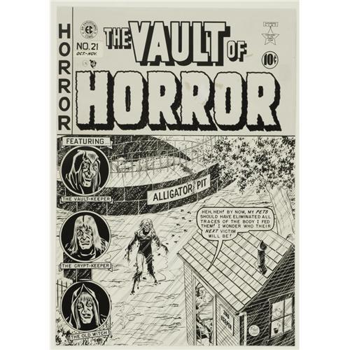 <B>Johnny Craig - Vault of Horror #21, Cover Original Art (EC, 1951).</B></I> With his heart-stopping ability to create quiet, mounting terror, Johnny Craig was tapped by Bill Gaines to create the first cover of <B>Vault of Horror</B></I>, and every ensuing issue through the end of the run nearly five years later. In this particularly grisly cover by Craig, the remains of a psychotic zoo keeper's victim have emerged from an alligator pit to exact retribution. "He did some of our best covers," Gaines recalled. "Including the infamous severed head cover, which may be the most famous cover ever in comics, and certainly the only one ever to be the focus of an inquiry before the United States Senate." A slow, meticulous craftsman, in a career that spanned four decades, that Craig's relatively small body of work has been influential and well-remembered is testimony to his skill. The image area of this horrific masterpiece measures 13" x 18.5", and, aside from some light staining on the original logo stat, the art is in Excellent condition.