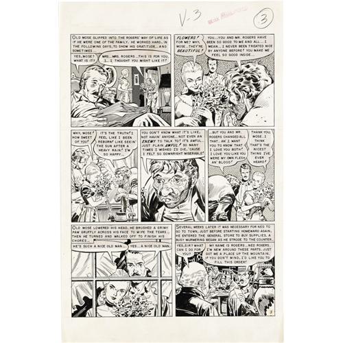 <B>Johnny Craig - Vault of Horror #40, page 3 Original Art (EC, 1954).</B></I> EC fan-addict art collectors are sure to be awed by this crisply inked page from the heart of Johnny Craig's peak period at EC - it's a simply sensational piece by one of EC's best editor/writer/artist triple-threat talents. From the spine-tingler "Old Man Mose," this page has an image area of 8.75" x 12". The dialogue balloons and captions are pasted-on stats; otherwise, the art is in Excellent condition. <BR><BR><B>Important notice:</B> Heritage usually auctions material at the rate of 200-250 lots per hour. On some occasions eBay Live bid software or the Internet may not be able to keep up with the pace of the auction. We recommend placing a realistic absentee bid now as insurance to avoid disappointment. Occasionally the auctioneer may eliminate or reject an eBay Live bid, and the auctioneer may also reopen a lot after the close of the eBay live bidding (usually because we missed an audience bid), and may reject your bid even if it shows you as the winning bidder. By bidding via eBay Live, you agree that Heritage may award the lot to another bidder at its sole discretion under the circumstances described above or any other reasonable circumstances. Since eBay bids are not shown to us until we open the lot on the floor, we treat those bids just like floor bids. In most cases the floor responds before the eBay bid is presented to us, due to Internet lag time, so for consistency we have made it a policy that floor bids are always considered first over tie eBay live bids. Also please note that all Heritage lots purchased through eBay Live carry a 22.5% Buyer's Premium. Please make sure you read the Terms and Conditions before you bid. This lot is being auctioned in conjunction with a live floor auction by Heritage Auction Galleries. All final auction and invoice information will be supplied by Heritage Auction Galleries, and all other information should be considered preliminary. Lot:41001 <BR><BR><B>Winning Notification and Billing:</B> After the FINAL session in this auction is complete, Heritage will send e-mail and snail mail invoices. This process normally takes several days. All final auction and invoice information will be supplied by Heritage Auction Galleries, and all other information should be considered preliminary. <BR><BR>This auction will be conducted on a live auction floor and over the Internet through eBay Live. If you choose to place an absentee bid, please take a moment to <font color='#0000ff'><u><a href='http://pages.ebay.com/liveauctions/help/before/laabsentee.html'>learn how eBay Live absentee bidding works</a></u></font><font color='#000000'>