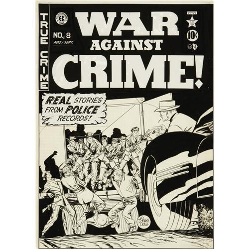 <B>Johnny Craig - War Against Crime #8 Cover Original Art (EC, 1949).</B></I> From the late, great Johnny Craig comes a galvanized gang-busting scene, as the men in blue seem to be winning this particular battle in the <B>War Against Crime</B></I>. The image area of this crime-stopper measures 13" x 18.5". The title logo stat and caption box are replacements; otherwise, the art is in Excellent condition.
