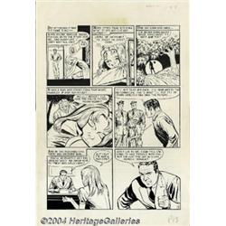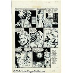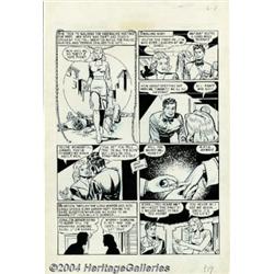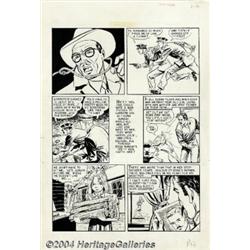 Johnny Craig and Al Feldstein - Original Art for Crime Patrol #13, Complete 8-page Story, "Edna Sunday" (EC, 1949). Johnny Craig and Al Feldstein teamed up on this story, using their joint pseudonym "F. C. Aljon." Johnny Craig wrote and drew most of this story. EC expert Bill Mason, in his art analysis of this story wrote, "Feldstein's only contribution is the pencils from panel 5, page 5 to the end." The overall art paper measures 15" x 22", with an image area of 13" x 18". Some of the blue under-penciling shows from beneath the inks. The title splash on page 1 has a fascinating art correction. The top, corrected panel has come loose, revealing the original panel art beneath it. This art, under the large portrait of Edna Sunday, is a close-up scene of a man being garroted with a rope. How interesting that this early pre-Code Crime art was edited with such restraint. Craig would later go on to do some of the most famous, and gruesome, cover scenes for EC. The Crime Patrol title stats at the top of each page have fallen off, leaving a glue stain. Important notice: Heritage usually auctions material at the rate of 200-250 lots per hour. On some occasions eBay Live bid software or the Internet may not be able to keep up with the pace of the auction. We recommend placing a realistic absentee bid now as insurance to avoid disappointment. Occasionally the auctioneer may eliminate or reject an eBay Live bid, and the auctioneer may also reopen a lot after the close of the eBay live bidding (usually because we missed an audience bid), and may reject your bid even if it shows you as the winning bidder. By bidding via eBay Live, you agree that Heritage may award the lot to another bidder at its sole discretion under the circumstances described above or any other reasonable circumstances. Since eBay bids are not shown to us until we open the lot on the floor, we treat those bids just like floor bids. In most cases the floor responds before the eBay bid is presented to us, due to Internet lag time, so for consistency we have made it a policy that floor bids are always considered first over tie eBay live bids. Also please note that all Heritage lots purchased through eBay Live carry a 20% Buyer's Premium. Please make sure you read the Terms and Conditions before you bid.