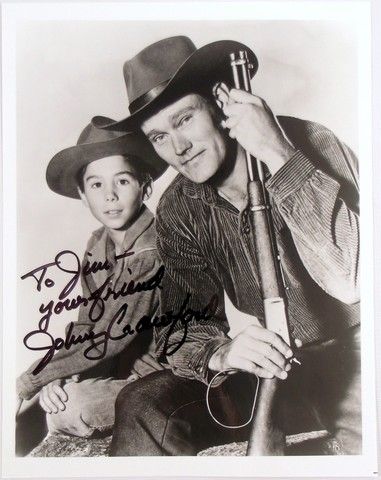 Johnny Crawford Rifleman Autographed Photo When Johnny Crawford got his co-starring role, with Chuck Connors in the classic western series "The Rifleman" (1958-1963), he was already known as one of the top child actors, especially in Western feature films, especially with John Wayne. He continued to act throughout his career, and then turned his sites to bringing back "Swing Music" to the world as the leader and singer of the most successful Swing Bands in modern times! This is a personalized autographed photo of Johnny with Connors from their iconic beloved series. (B&W 8"x10").