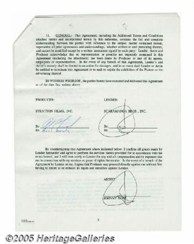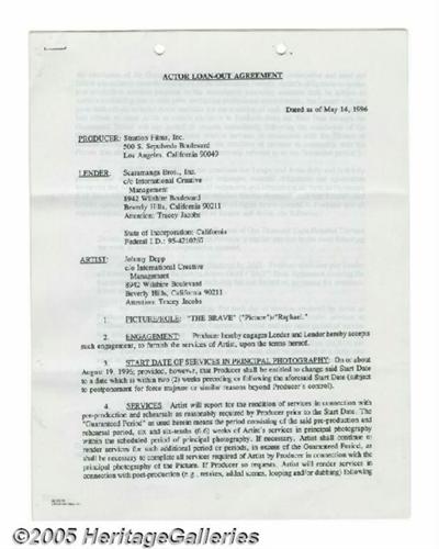 <B>Johnny Depp Signed Document.</B></I> Imagine having to get permission from yourself to appear in your own film. This five-page, 8.5" x 11" actor loan-out agreement between Stratton Films, Inc. and Johnny Depp's Scaramanga Bros., Inc. allowed the actor to appear in the role of "Raphael" in the 1996 movie "The Brave," which Depp also co-wrote and directed. The agreement is dated May 14, 1996, and signed by Depp in black ink in two places on the last page. In fine condition with the usual staple and binder holes. <I>With COA from PSA/DNA.</B></I>