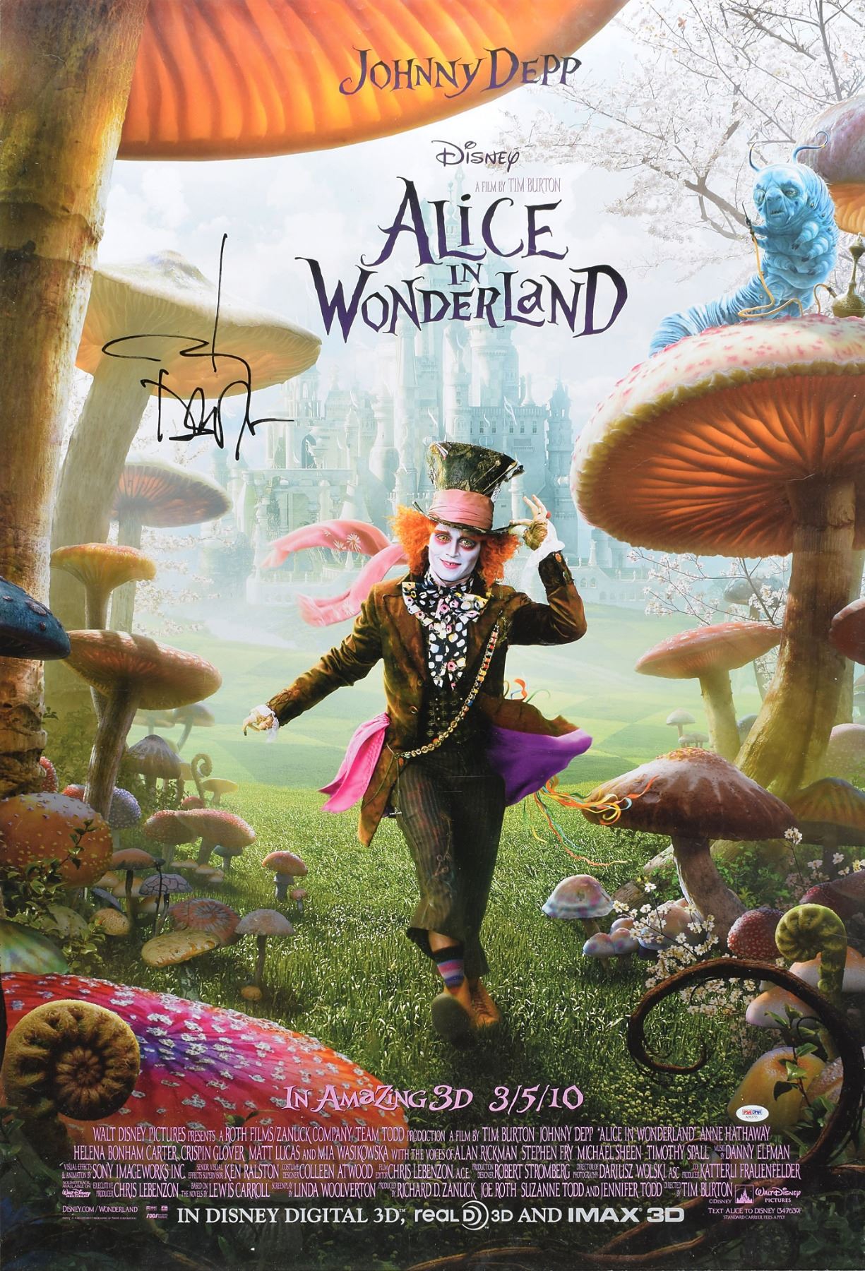 Attractive color 27 x 40 poster for Tim Burton's 2010 fantasy adventure film Alice in Wonderland, showing the Mad Hatter and Absolem the caterpillar in front of the Queen's Castle, signed in black felt tip by Johnny Depp. Rolled and in fine condition, with a PSA/DNA authentication label affixed to the lower right corner.