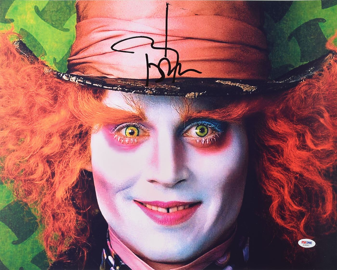 Color satin-finish 20 x 16 close-up photo of Johnny Depp as the Mad Hatter in Tim Burton's 2010 dark fantasy film Alice in Wonderland, signed in black felt tip by Depp. In fine condition, with slightly grainy image quality and a PSA/DNA label affixed to lower right corner. Accompanied by a certificate of authenticity from PSA/DNA.