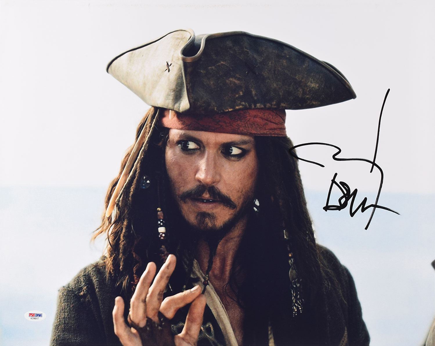 Color satin-finish 20 x 16 close-up photo of Johnny Depp as the legendary pirate Jack Sparrow from the Pirates of the Caribbean film series, signed in black felt tip. In fine condition, with a PSA/DNA label affixed to lower left corner. Accompanied by a certificate of authenticity from PSA/DNA.