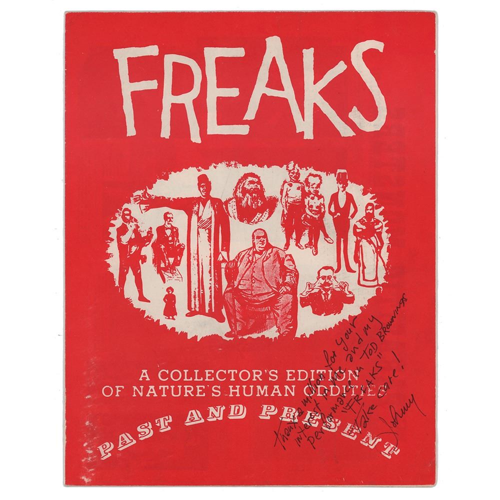 Insert for the softcover 1968 book Freaks: A Collector's Edition of Nature's Human Oddities by Giovanni Iuliani, 8.5 x 11, signed on the front in black ink by Johnny Eck, “Thanx a million for your interest in my and my performance in Tod Browning’s ‘Freaks,’ Take care! Johnny.” The insert unfolds into a two-sided poster measuring 22 x 17.25, with Eck signing again next to his image: “To Bob White, Sincerely, Johnny Eck.” In fine condition.