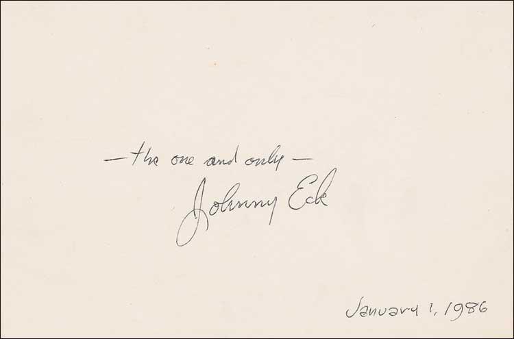 Freak show performer missing the lower half of his torso best known for his role in the 1932 cult classic film, Freaks. He was often billed as the amazing "Half-Boy" and "King of the Freaks.” Ballpoint signature, “—the one and only—Johnny Eck, January 1, 1986,” on an off-white 6 x 4 card. In very fine condition. Pre-certified PSA/DNA and RRAuction COA.