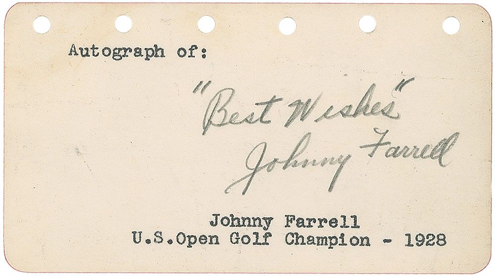 Professional golfer (1901–1988) best known for winning the 1928 US Open. Vintage pencil signature, “‘Best wishes,’ Johnny Farrell,” on an off-white 4.5 x 2.5 page. Overall creases and wrinkles, otherwise fine condition.