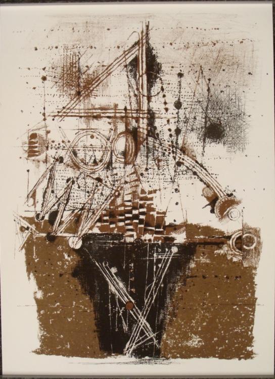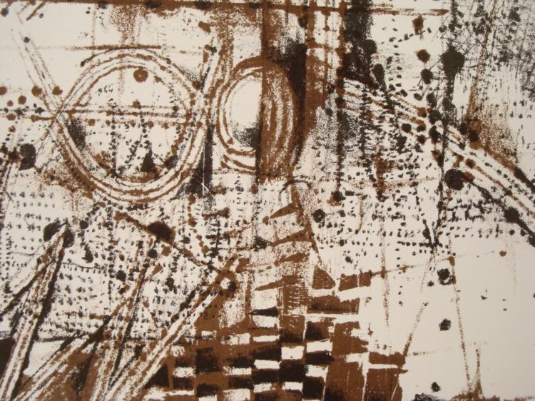 This is an abstract image in black and brown, featuring the artist's sketch-like style, and subtle shading. Artist: Johnny Friedlaender Medium: Print on paper Paper Size: 9 3/4 x 13 3/8 inches Condition: Excellent; slight dent mark on the edge, left side top Biography: * Johnny Friedlaender (1912-1992) Attended Breslau Art Academy in 1928, where he was taught by master Otto Mueller. He settled in Paris after the war, and began exhibiting around Europe. He became noted as an inventor of colored printmaking, and a school was formed in Paris around his work. In 1987 the Kunsthalle Bremen held a retrospective of Friedlaender's work. He is widely known and collected today. *