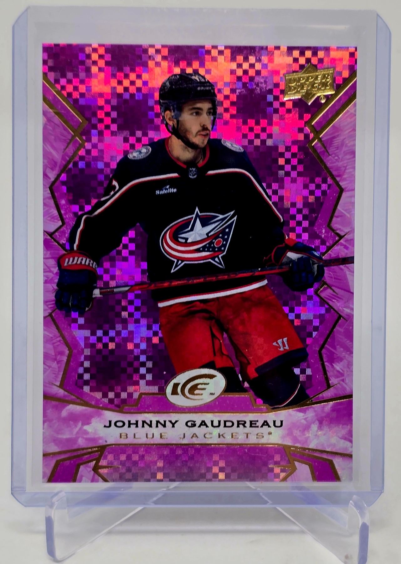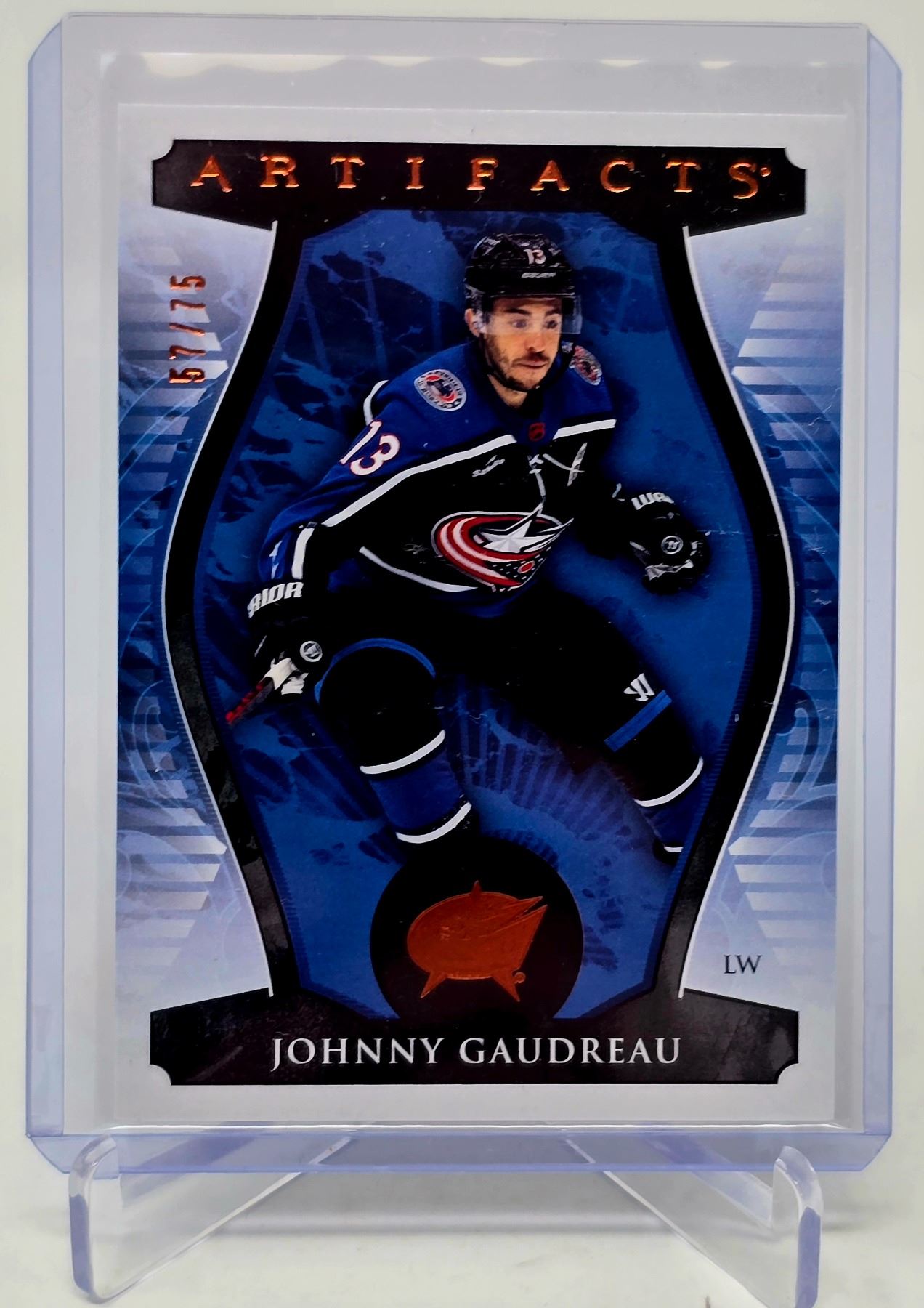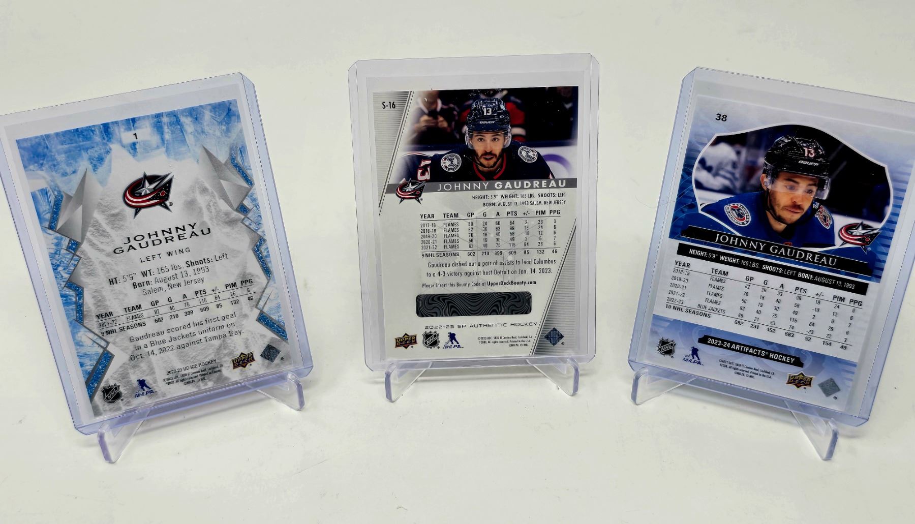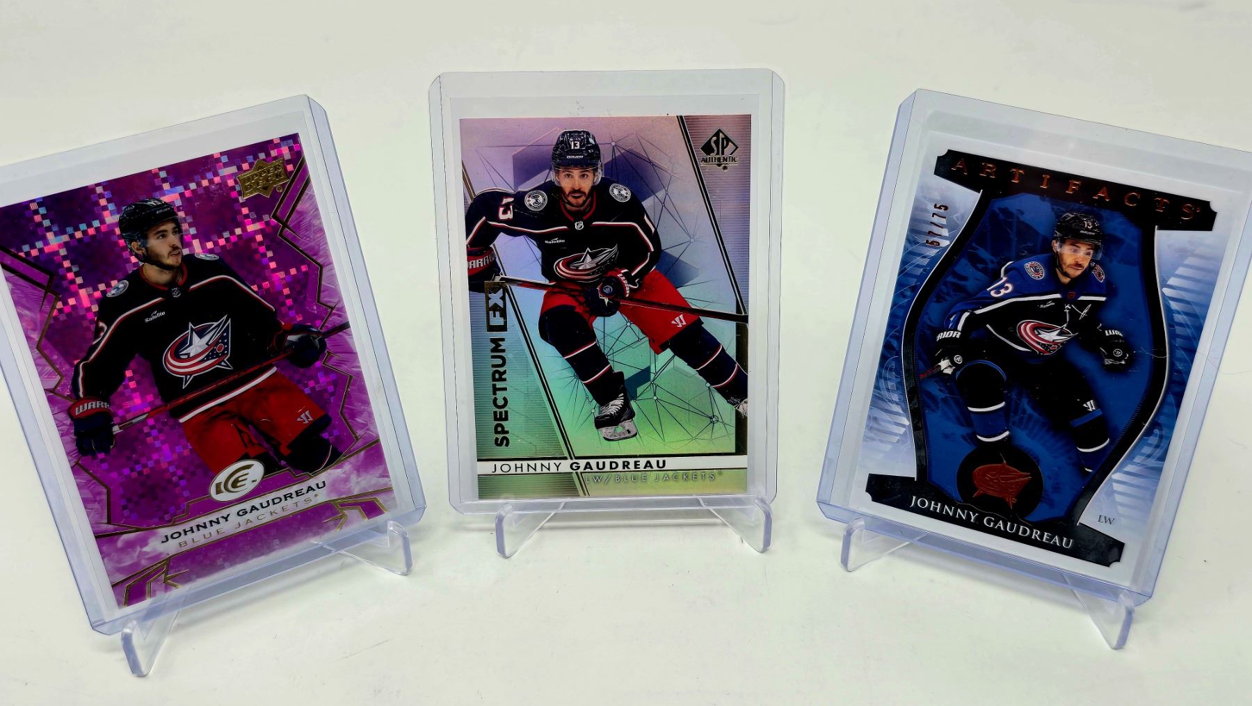 Three-card Johnny Gaudreau lot with Blue Jackets: Elite Pink Foil, SP Spectrum FX, and Artifacts #d 54/75. Premium inserts for collectors.