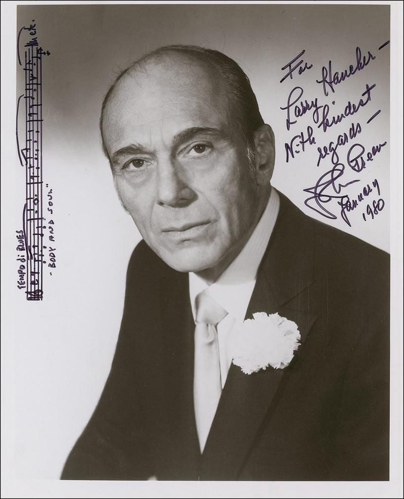 Glossy 8 x 10 photo, signed and inscribed in black felt tip “For Larry Hancher—With kindest regards—John Green, January 1980,” with Green adding a five bar AMQS to ‘Body and Soul’ along the left edge. In fine condition, with a few scattered light creases.