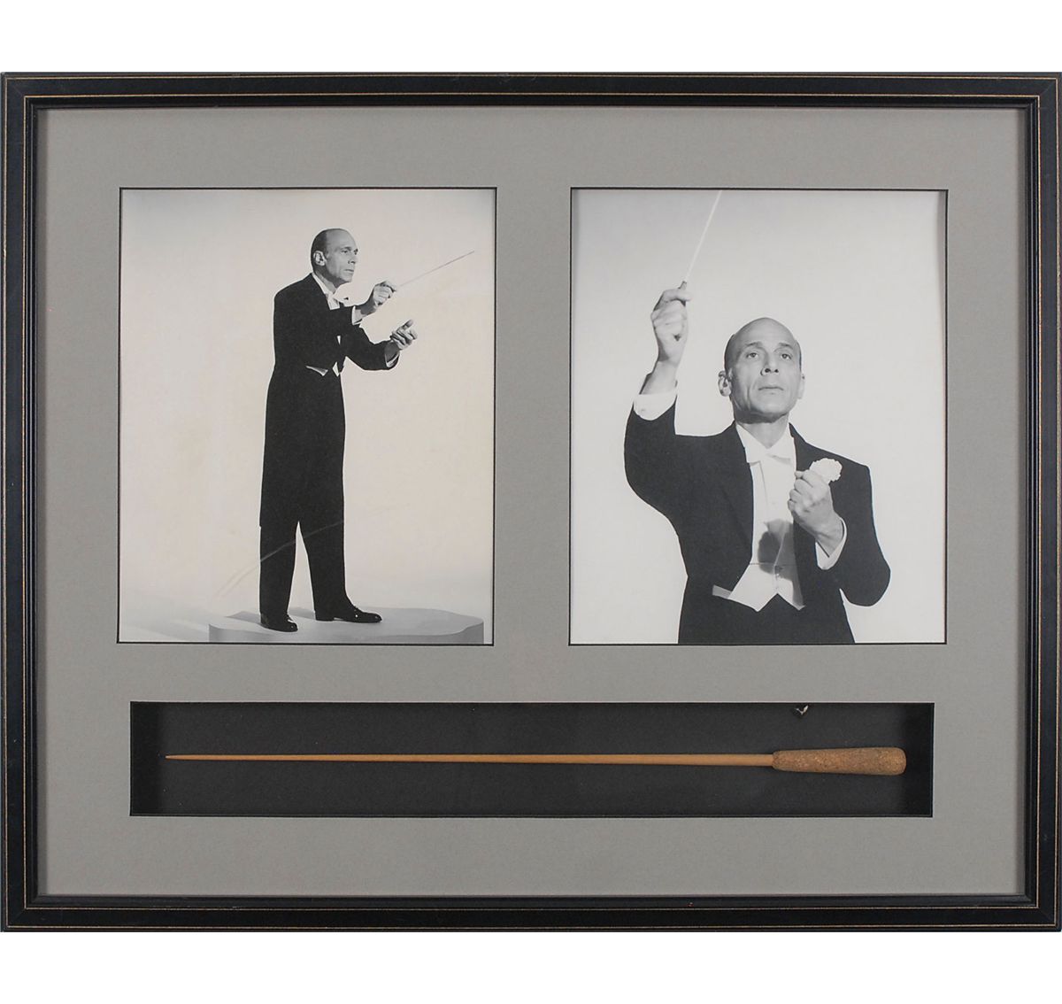 Songwriter and musical arranger (1908–1989) who was in charge of several successful MGM film musicals, winning Oscars for Easter Parade and An American in Paris. Green’s performance-used conducting baton, measuring 14.5? long, constructed of wood with a cork grip. Nicely mounted and framed with two unsigned publicity photos to an overall size of 21 x 17. In fine condition.