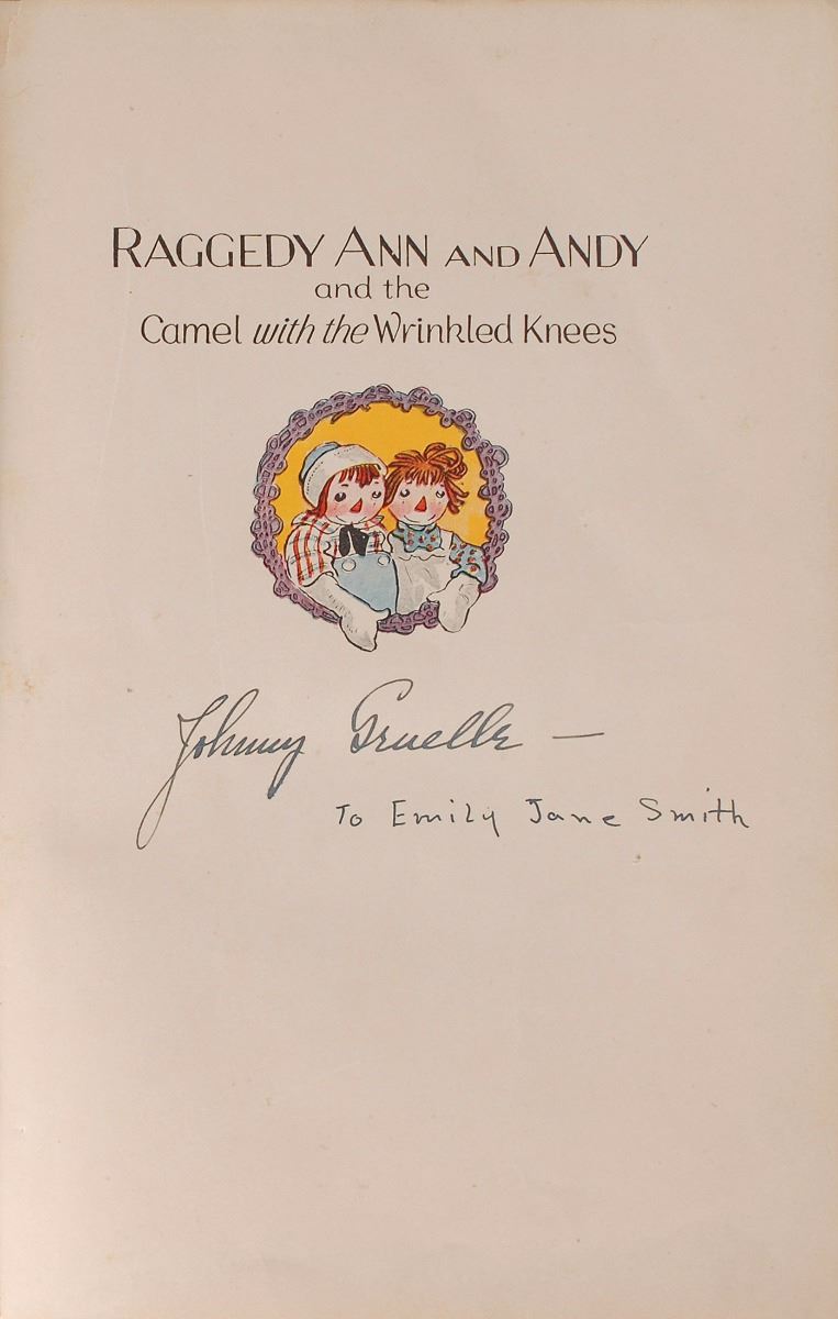 Signed book: Raggedy Ann and Andy and the Camel with the Wrinkled Knees. Later printing. Joliet, IL: The P. F. Volland Company, 1924. Hardcover, 6.25 x 9.25. Signed on the half-title page in fountain pen, “Johnny Gruelle,” and inscribed below in another hand, “To Emily Jane Smith.” Autographic condition: fine. Book condition: G+/None.