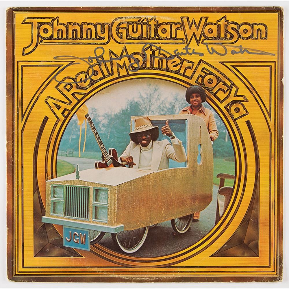 A Real Mother For Ya album by Johnny Guitar Watson, who has signed the front cover in silver ink. In fine condition. The record is included.