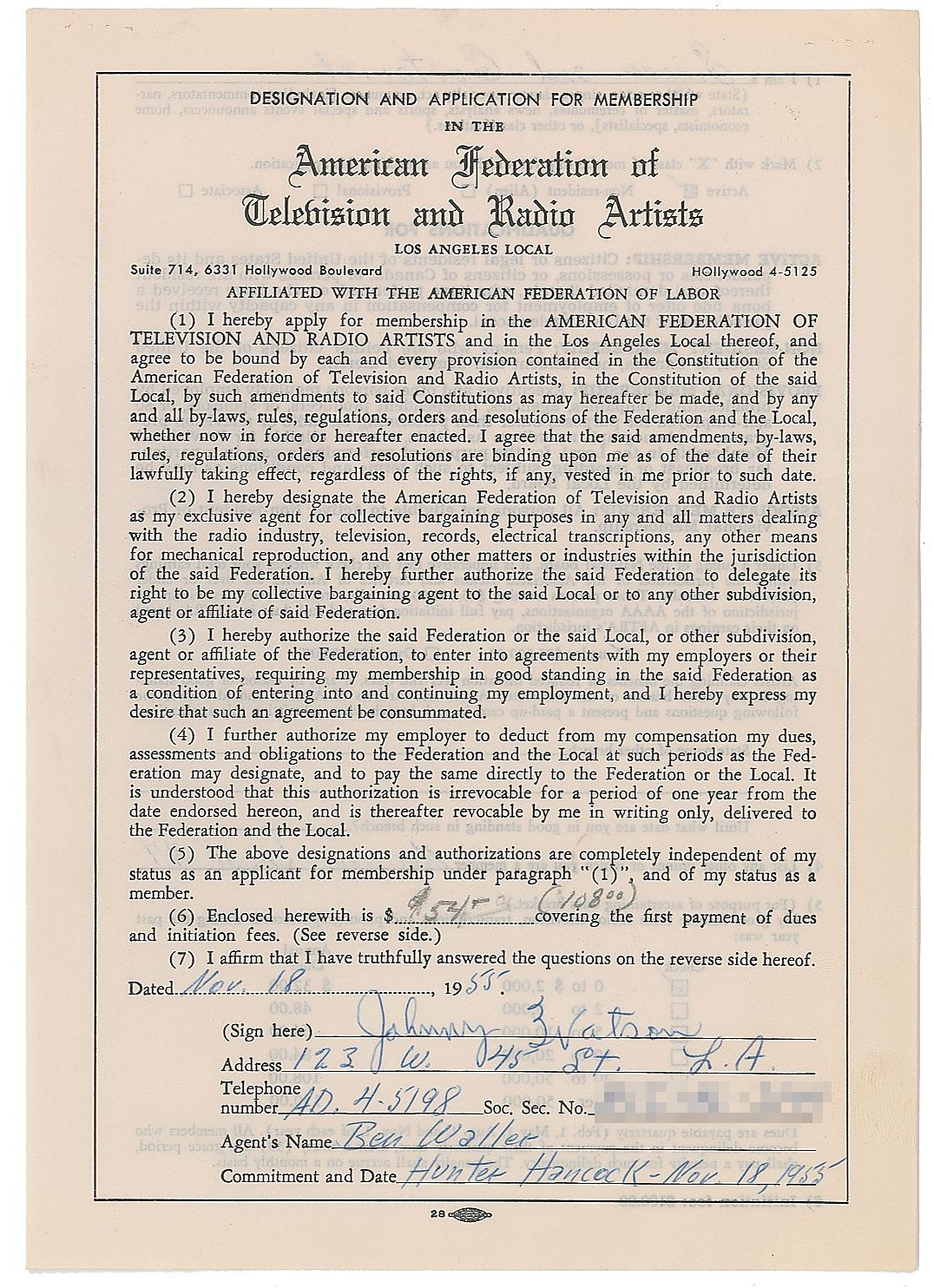 Blues, soul, and funk musician and singer-songwriter (1935–1996) remembered as a flamboyant showman. Partly-printed DS, signed “Johnny Watson,” one page, 6.5 x 9, November 18, 1955. Application for membership in the American Federation of Television and Radio Artists (AFTRA), signed at the conclusion by Watson and filled out with his address. In fine condition. Accompanied by an unsigned photo of Watson with his guitar.