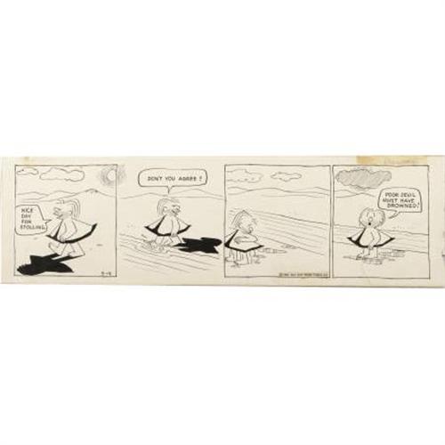 <B>Johnny Hart - B.C. Daily Comic Strip Original Art, dated 5-14-58 (New York Herald Tribune, 1958).</B></I> This early <I>B.C</B></I>. daily by Johnny Hart has an image area of 17.5" x 4.5". Aside from some slight paper tanning, light soiling, and a tear in the lower portion of the final panel, the art is in Very Good condition. <BR><BR><b>Shipping:</b> Flat Material, Small (<a target="_blank" href="http://www.heritageauctions.com/common/shipping.php">view shipping information</a>)