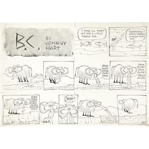 <B>Johnny Hart - B. C. Sunday Comic Strip Original Art, dated 7-18-71 (Field Enterprises, 1971).</B></I> Apparently there's more than one way to catch and eat a fish -- we haven't seen a prehistoric critter this thirsty since "Gertie the Dinosaur." This<I> B. C. </B></I>episode from the seventies has an image area of 19" x 13". Aside from having been cut between each panel tier, this strip is in Excellent condition. There is a note about the piece written in French on the back of the page, so this episode may have spent some time abroad.<BR><BR><b>Shipping:</b> Flat Material, Large (<a target="_blank" href="http://www.heritageauctions.com/common/shipping.php">view shipping information</a>)
