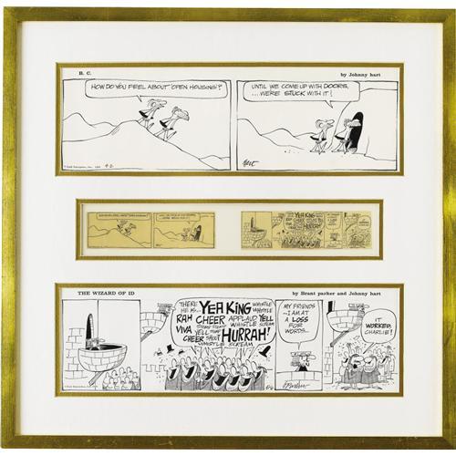 <B>Johnny Hart - B. C. and Wizard of Id Daily Comic Strip Original Art (Field Enterprises, 1969).</B></I> Two classic strips by a true modern master of the medium, Johnny Hart, make up this cool group. First, a look back in time to those crazy cave men of <I>B.C.</B></I>, in a strip dated 4-2-69; next up, a trip to the Dark Age humor of <I>Wizard of Id</B></I>, dated 5-6-69. Both pieces have image areas of 17" x 5.5", and are in Excellent condition. The art has been matted together, along with newspaper clippings of the printed strips, and has been framed to an overall size of approximately 23.75" x 23. <I>From the Estate of Bruce Hamilton.</B></I> <BR><BR><B>Important notice:</B> Heritage usually auctions material at the rate of 200-250 lots per hour. On some occasions eBay Live bid software or the Internet may not be able to keep up with the pace of the auction. We recommend placing a realistic absentee bid now as insurance to avoid disappointment. Occasionally the auctioneer may eliminate or reject an eBay Live bid, and the auctioneer may also reopen a lot after the close of the eBay live bidding (usually because we missed an audience bid), and may reject your bid even if it shows you as the winning bidder. By bidding via eBay Live, you agree that Heritage may award the lot to another bidder at its sole discretion under the circumstances described above or any other reasonable circumstances. Since eBay bids are not shown to us until we open the lot on the floor, we treat those bids just like floor bids. In most cases the floor responds before the eBay bid is presented to us, due to Internet lag time, so for consistency we have made it a policy that floor bids are always considered first over tie eBay live bids. Also please note that all Heritage lots purchased through eBay Live carry a 22.5% Buyer's Premium. Please make sure you read the Terms and Conditions before you bid. This lot is being auctioned in conjunction with a live floor auction by Heritage Auction Galleries. All final auction and invoice information will be supplied by Heritage Auction Galleries, and all other information should be considered preliminary. Lot:41001 <BR><BR><B>Winning Notification and Billing:</B> After the FINAL session in this auction is complete, Heritage will send e-mail and snail mail invoices. This process normally takes several days. All final auction and invoice information will be supplied by Heritage Auction Galleries, and all other information should be considered preliminary. <BR><BR>This auction will be conducted on a live auction floor and over the Internet through eBay Live. If you choose to place an absentee bid, please take a moment to <font color='#0000ff'><u><a href='http://pages.ebay.com/liveauctions/help/before/laabsentee.html'>learn how eBay Live absentee bidding works</a></u></font><font color='#000000'>