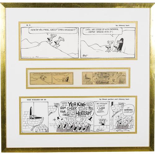 <B>Johnny Hart - B. C. and Wizard of Id Daily Comic Strip Original Art (Field Enterprises, 1969).</B></I> Two classic strips by a true modern master of the medium, Johnny Hart, make up this cool group. First, a look back in time to those crazy cave men of <I>B.C.</B></I>, in a strip dated 4-2-69; next up, a trip to the Dark Age humor of <I>Wizard of Id</B></I>, dated 5-6-69. Both pieces have image areas of 17" x 5.5", and are in Excellent condition. The art has been matted together, along with newspaper clippings of the printed strips, and has been framed to an overall size of approximately 23.75" x 23. <I>From the Estate of Bruce Hamilton.</B></I><BR><BR><b>Shipping:</b> Framed (<a target="_blank" href="http://www.heritageauctions.com/common/shipping.php">view shipping information</a>)