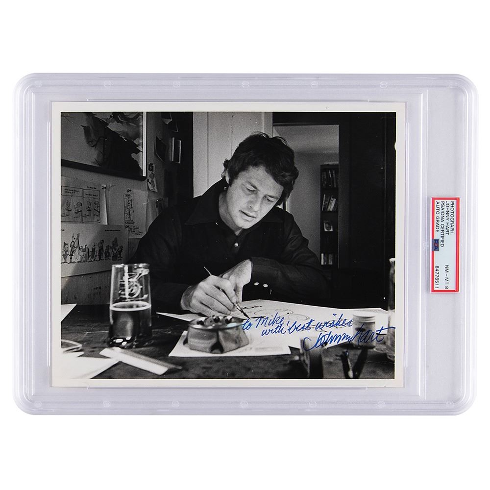 Glossy 10 x 8 photo of the B.C. and The Wizard of Id comic strips creator working at his desk, signed and inscribed in blue felt tip, "To Mike, with best wishes, Johnny Hart.& rdquo; In fine condition. Encapsulated and graded by PSA/DNA as "NM-MT 8."