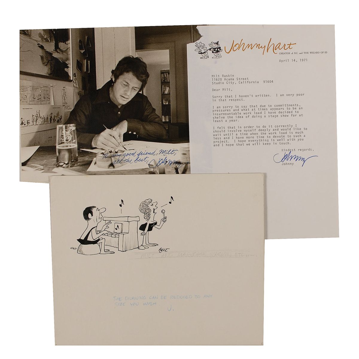 Four items: an original ink sketch of two cave people performing a musical number, on an off-white 10.25 x 8.5 card, signed under the image, “Hart,” with Hart adding a brief handwritten note at the bottom, signed “J.” Accompanied by its original mailing envelope, addressed by Hart and signed in the return address area; a matte-finish 9.25 x 7.5 photo of Hart working on a sketch, signed and inscribed in blue ink; and a one page TLS, signed “Johnny,” 7.25 x 10.5, accompanied by the original mailing envelope. In fine overall condition.