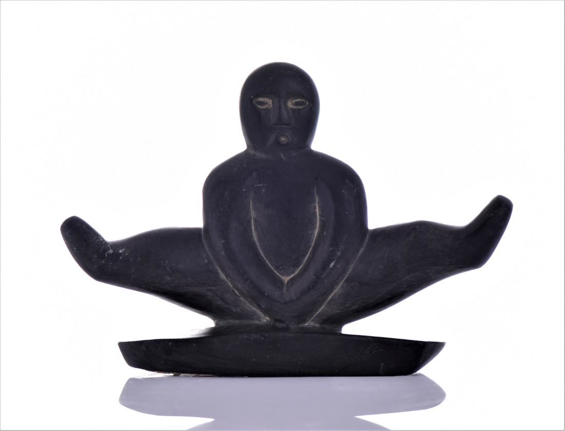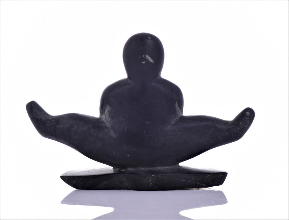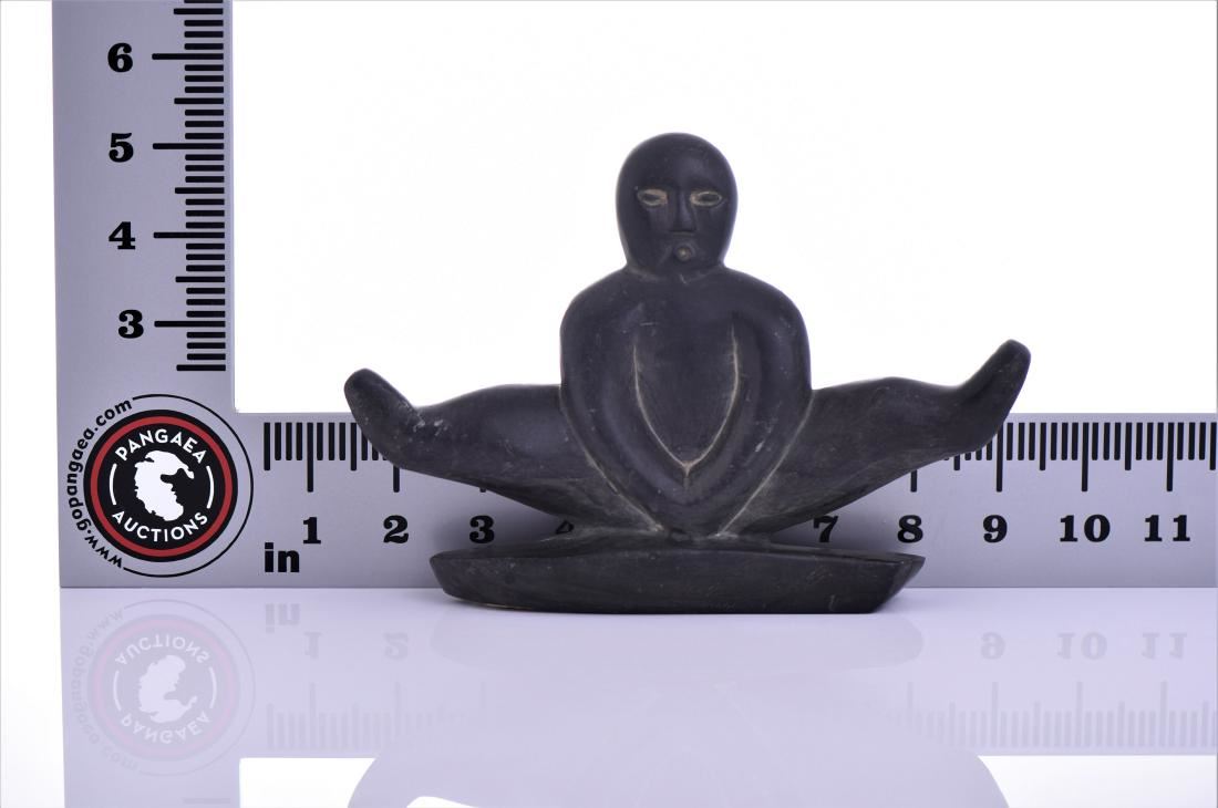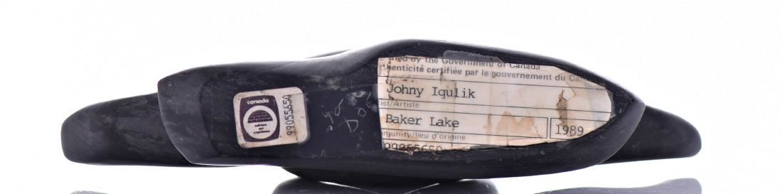 Johnny Iqulik (Iquliq) (1966-1996), 1989 Inuit Stone Sculpture, Baker Lake, Nunavut Territory, Canada. Estimated less than 50 yrs old. Northwest, First Nations, Inuit and Metis art refers to artwork produced by the people of the Arctic North West previously known as Eskimos, a term that is now often considered offensive outside Alaska. Historically their preferred medium was walrus ivory, but since the establishment of southern markets for Inuit art in 1945, prints and figurative works carved in relatively soft stone such as soapstone, serpentinite, or argillite have also become popular. Inuit sculptures had been produced prior to contact with the Western world. Inuit continue to carve pieces entirely by hand. Power tools are occasionally used, but most artists prefer to use an axe and file, as this gives them more control over the stone. The final stage of carving is the polishing, which is done with several grades of waterproof sandpaper, and hours and hours of rubbing. The most common material is now soapstone, serpentine, either deposits from the Arctic, which range from black to light green in color. Other material used in Inuit sculptures include, caribou antlers, ivory from marine mammals, and the bone of various animals. (Wikipedia) Size and/or Weight: See Measurement Photo. (Photos Represent The Lot Condition.)