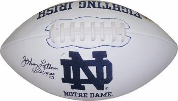 Johnny Lattner was a halfback for the University of Notre Dame where he won the Heisman Trophy in 1953, and won the Maxwell Award twice, in 1952 and 1953. Johnny Lattner has hand autographed this Notre Dame Fighting Irish White Logo Football with Heisman 53 inscription (signed on left side). MAB Hologram and Certificate of Authenticity from Athlon Sports.