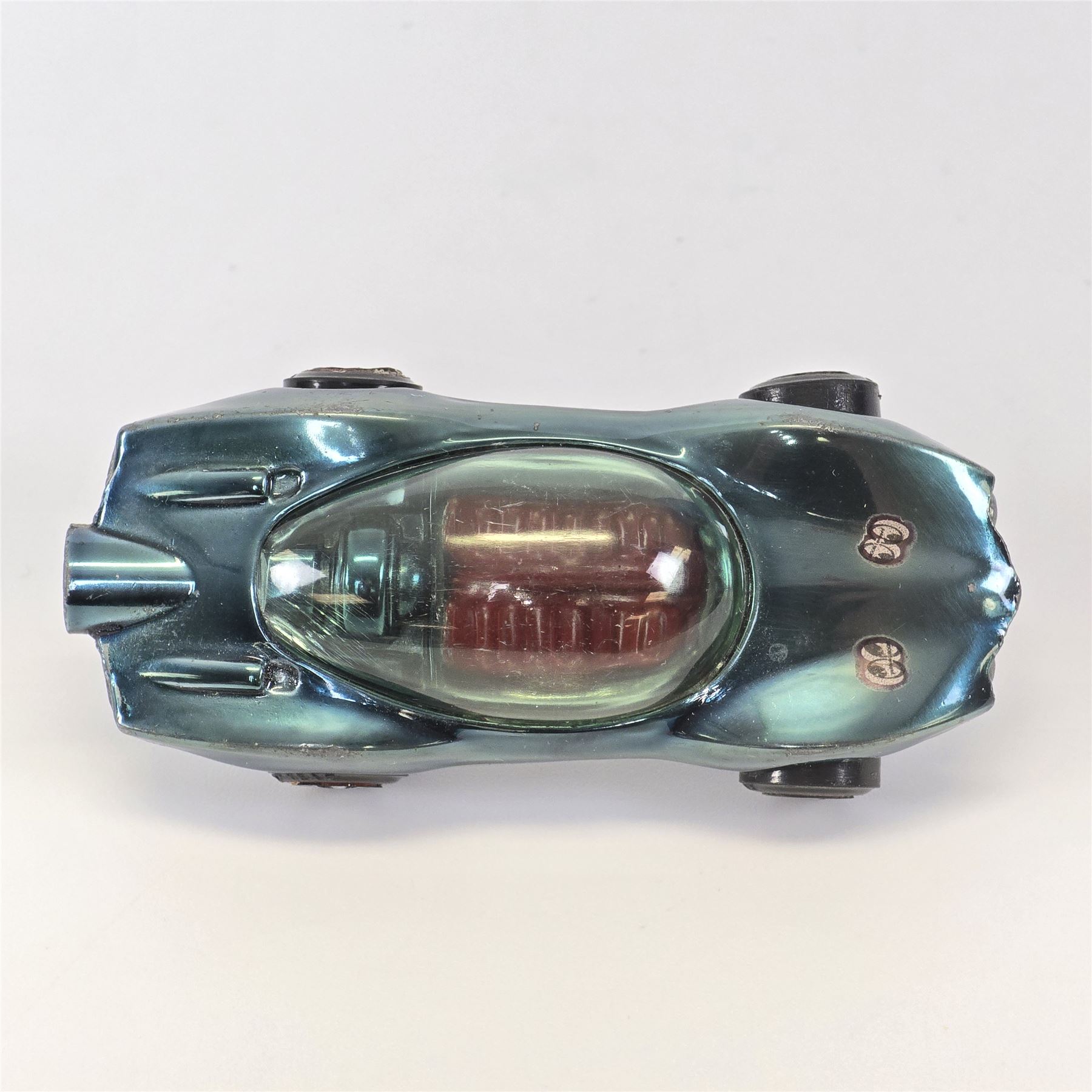 Nice condition overall with a few nicks. Has some light toning throughout. Glass is crack free. Wheel chrome is clean. Base is lightly tarnished.