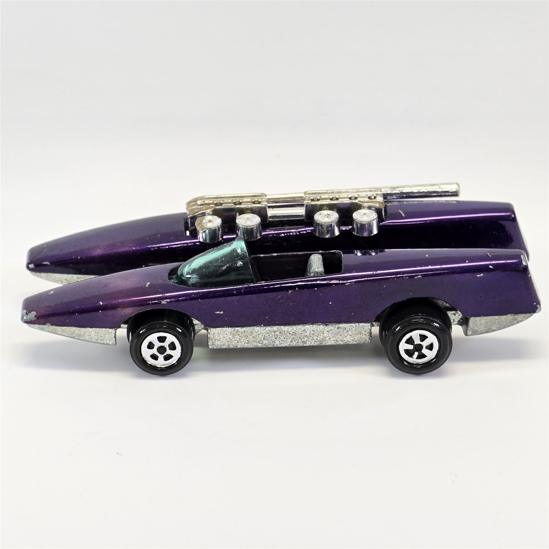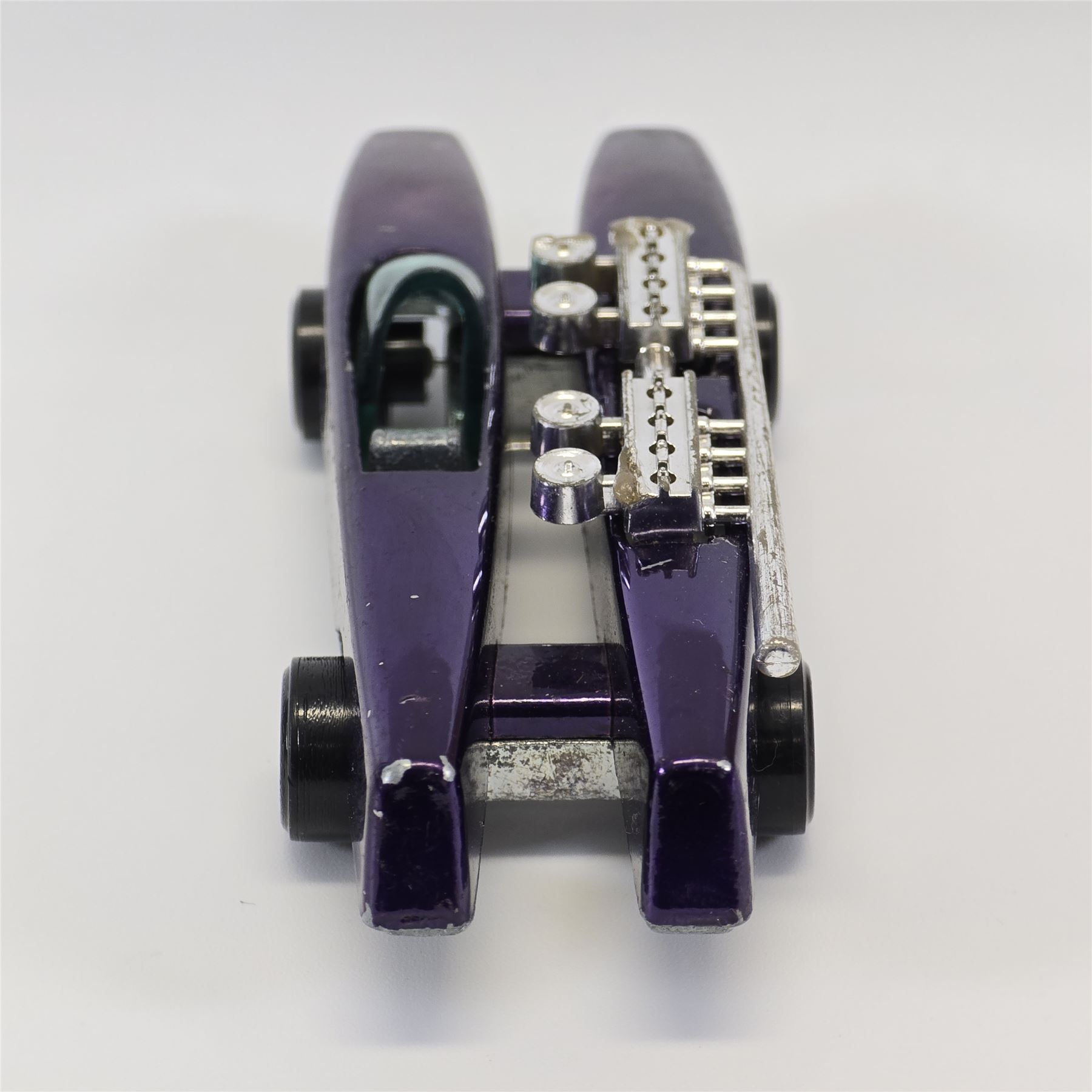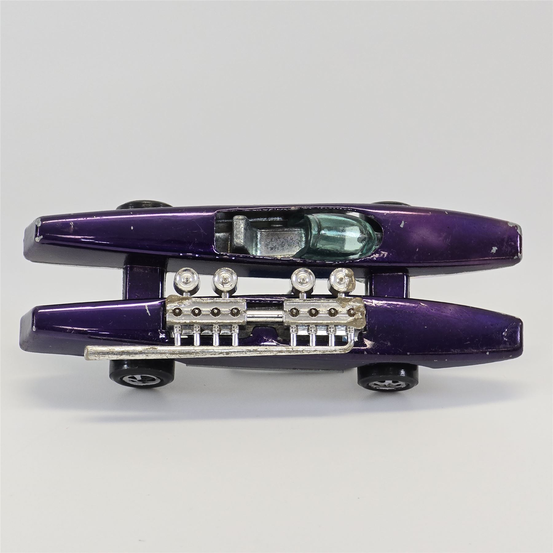 Nice condition overall with some slight wear. Has toning throughout. Glass is crack free. Motors and exhaust pipes intact. Wheel chrome is clean. Base is lightly tarnished.