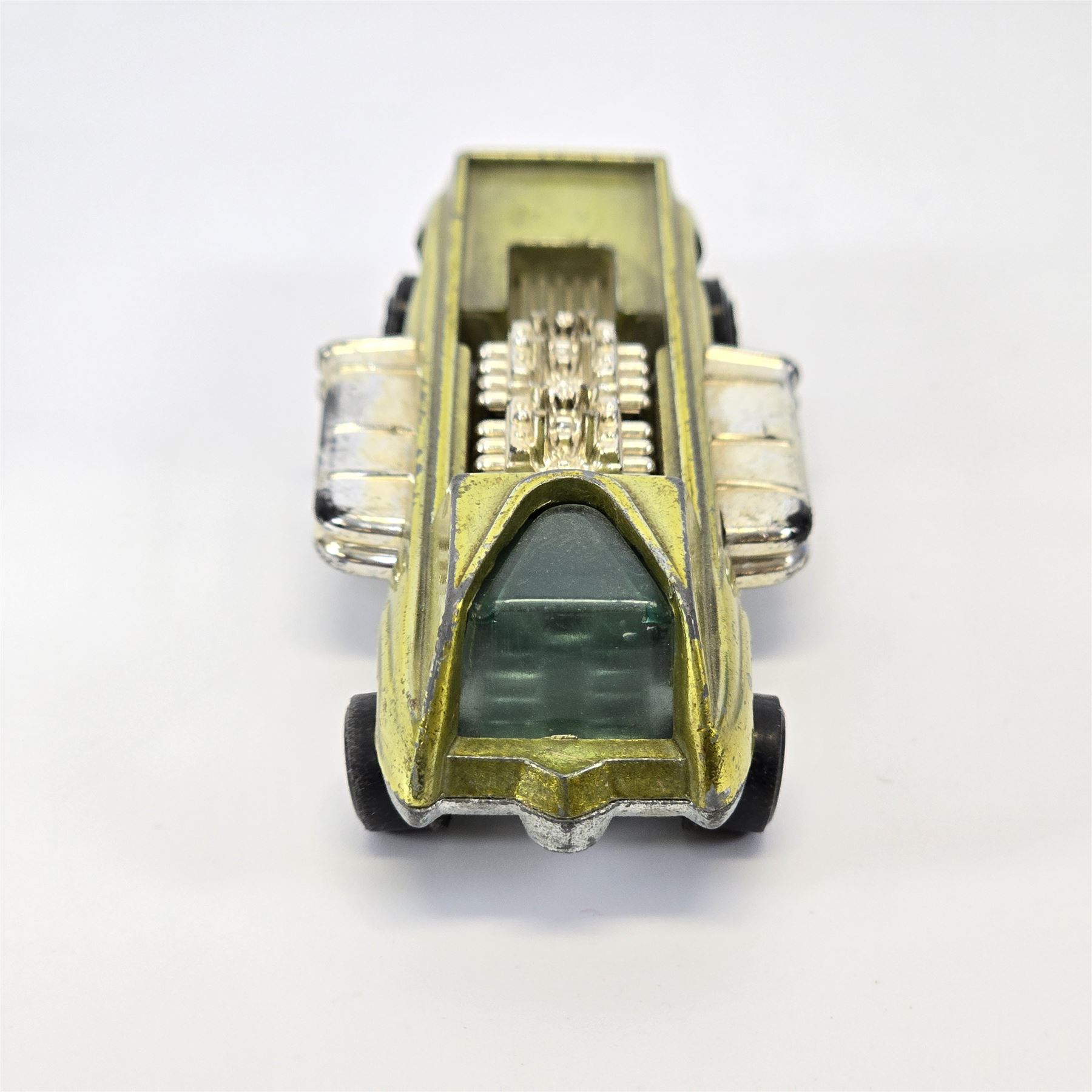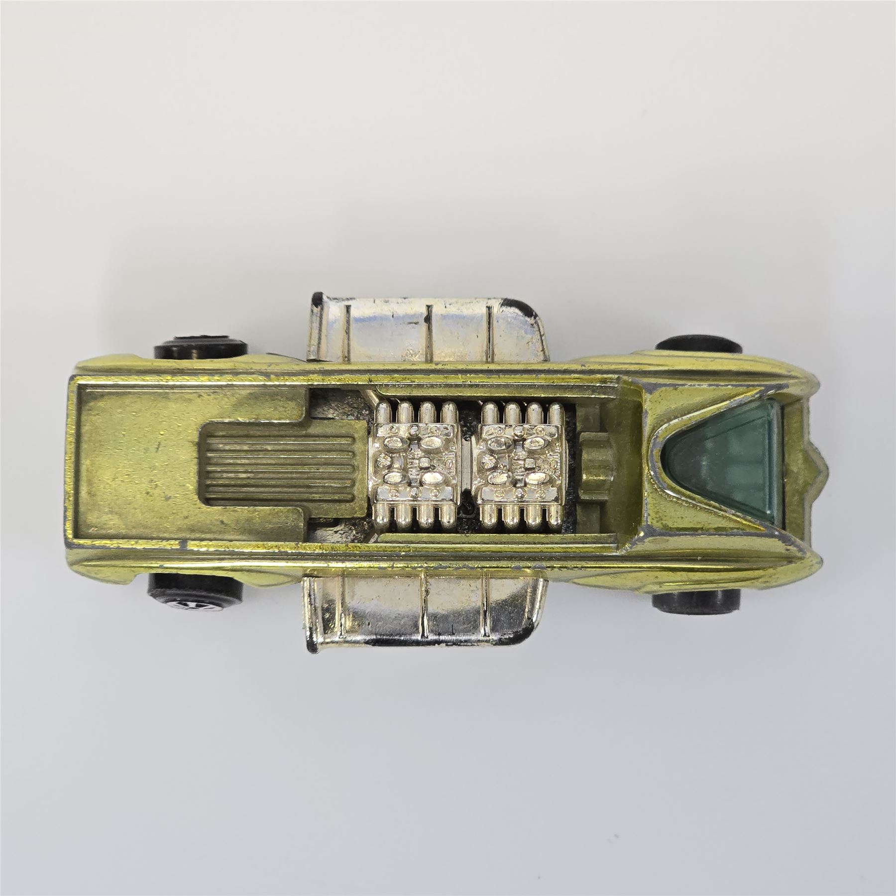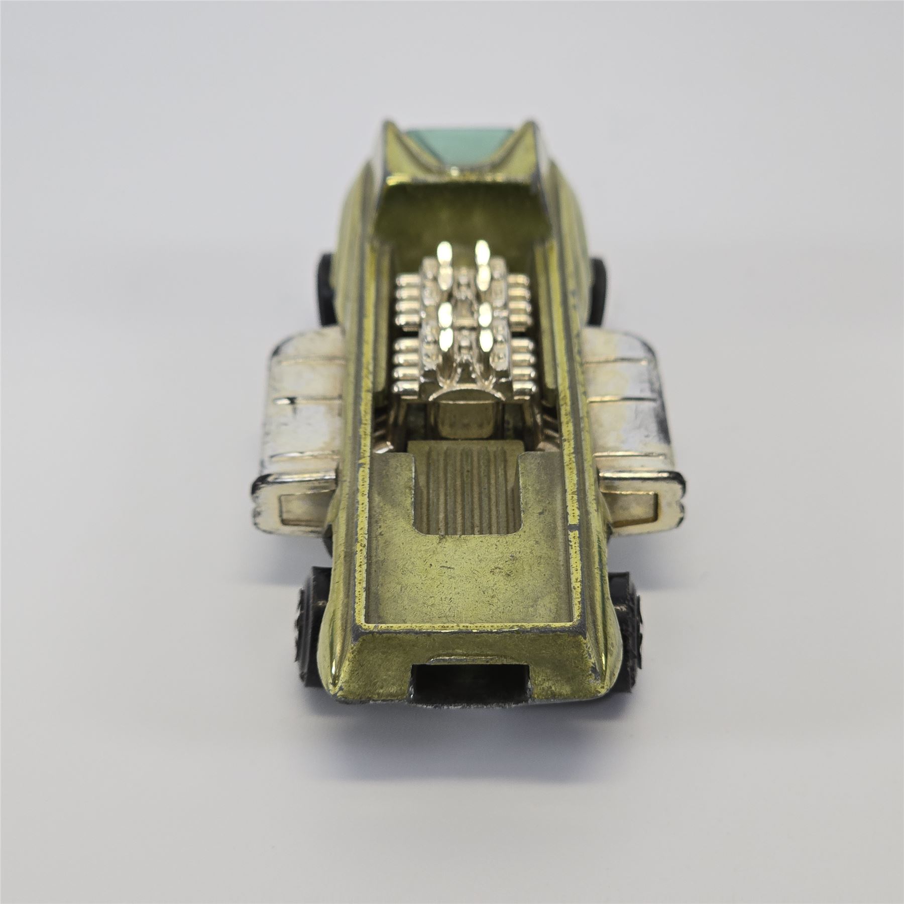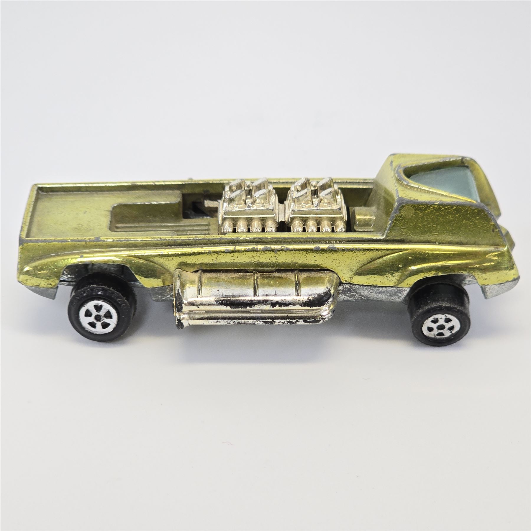 Nice condition overall with some wear throughout. Has toning throughout. Glass is crack free. Motors intact. Tow hook is missing. Wheel chrome is clean. Base is lightly tarnished.