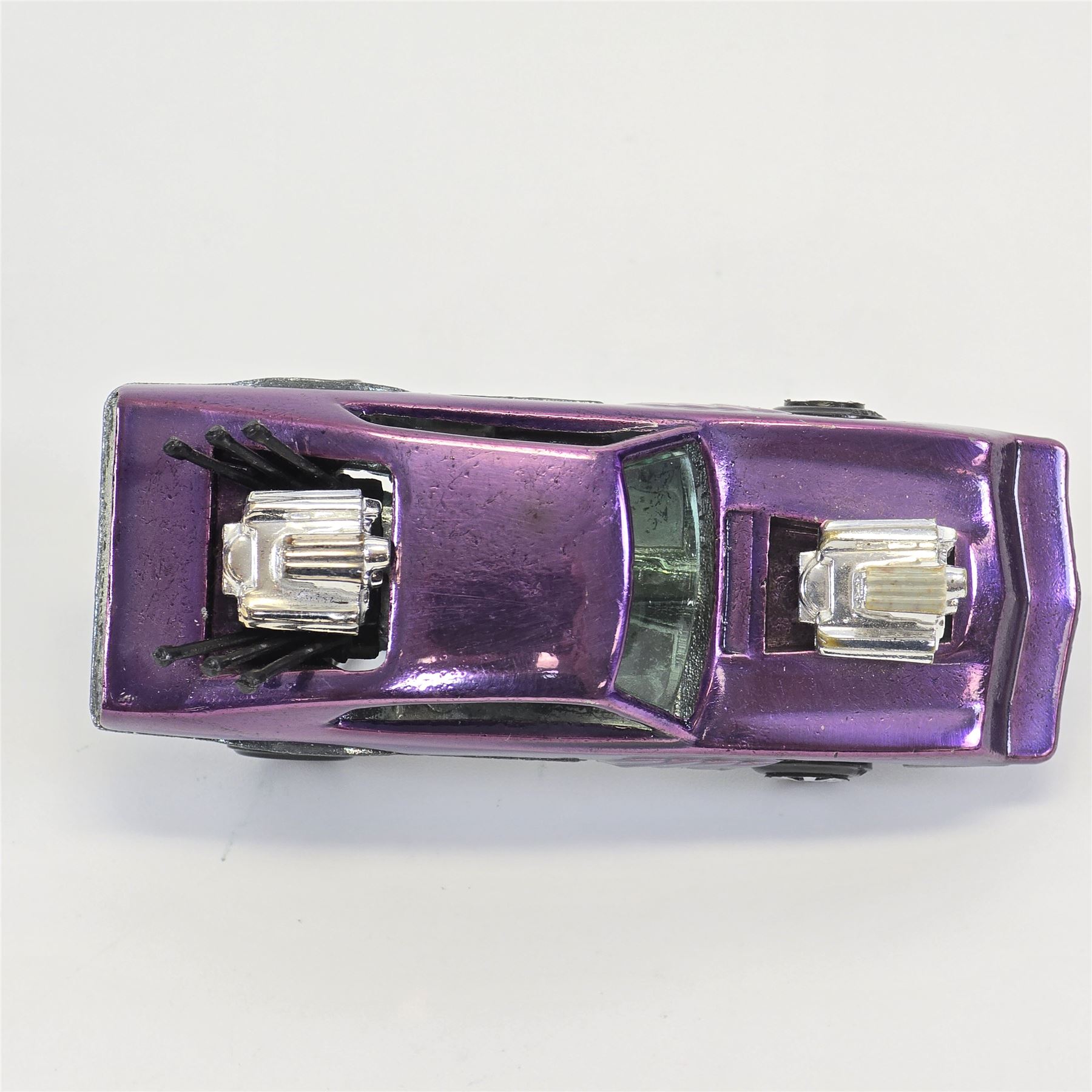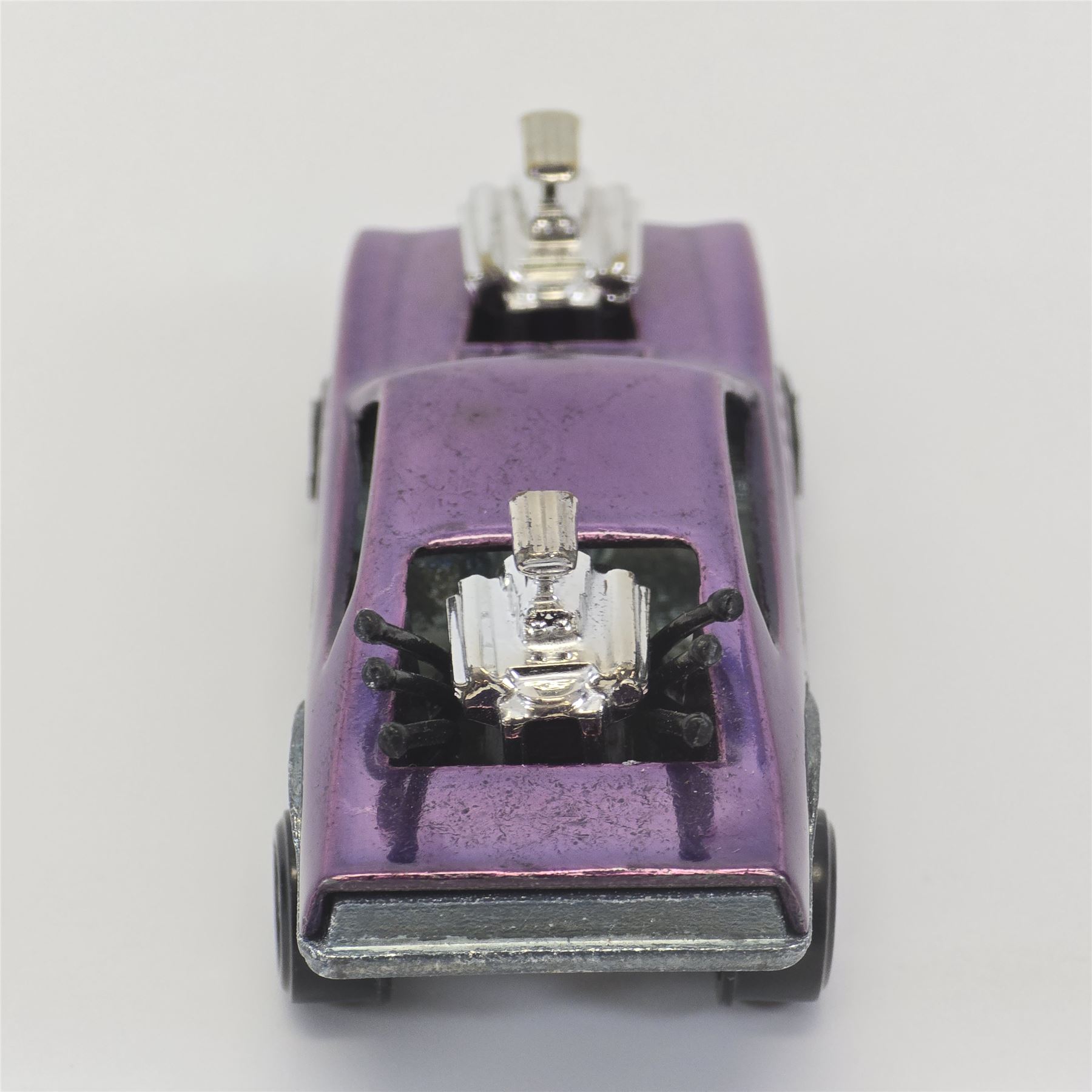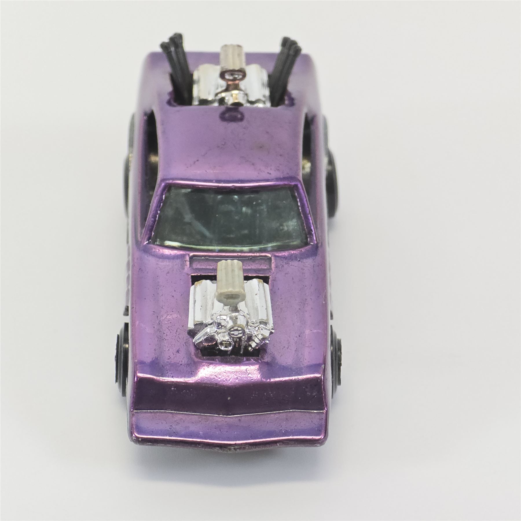 Nice condition overall with a few nicks. Has some light toning throughout. Glass is crack free. Motors and exhaust pipes intact. Wheel chrome is clean. Base is lightly tarnished.