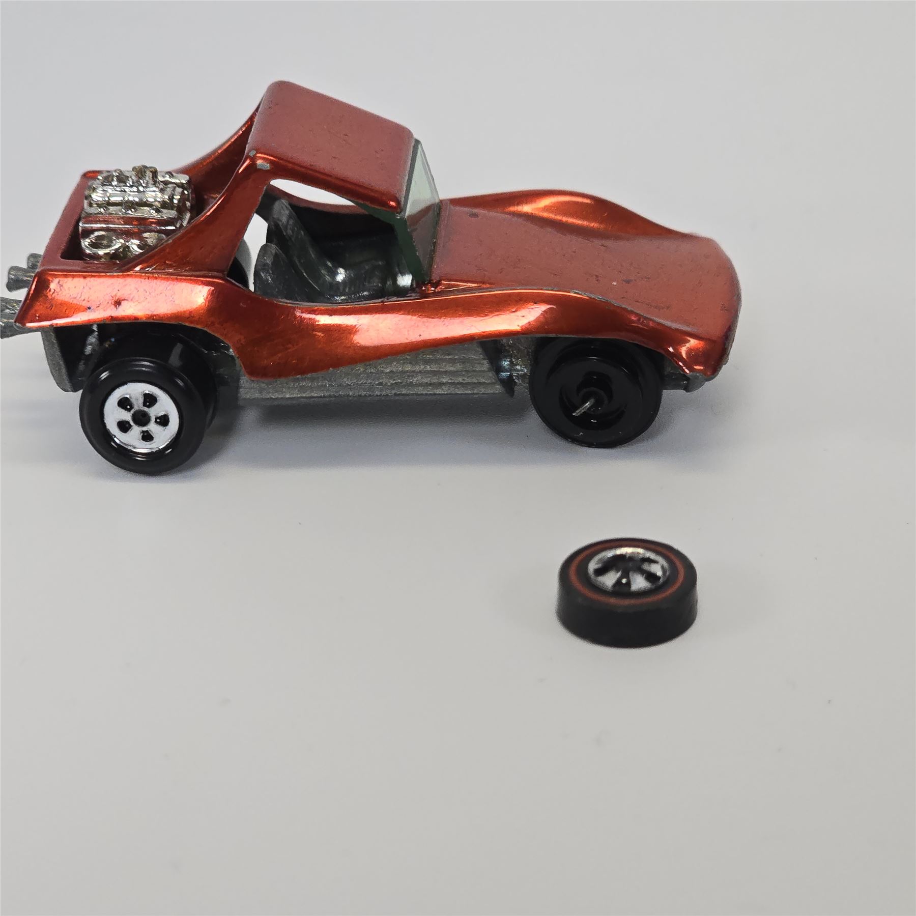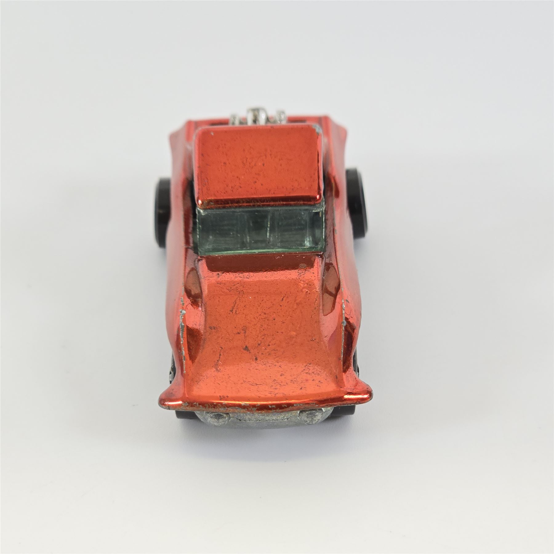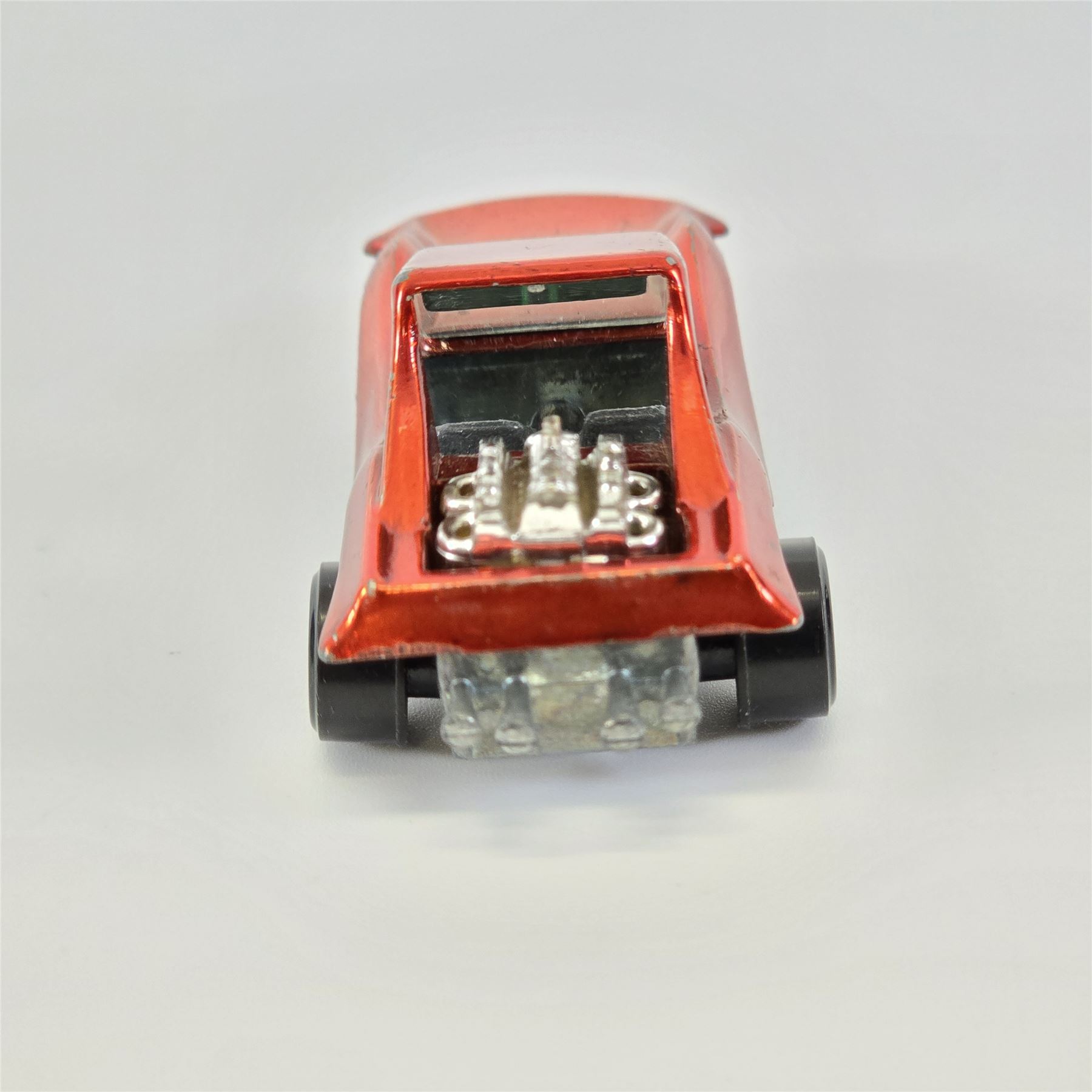 Nice condition overall with some light wear. Has some toning throughout. Glass is crack free. Motor is intact. Wheel chrome is clean. However a repair was made, and front axles were replaced with Hot wheels redline wheels. Base is lightly tarnished.