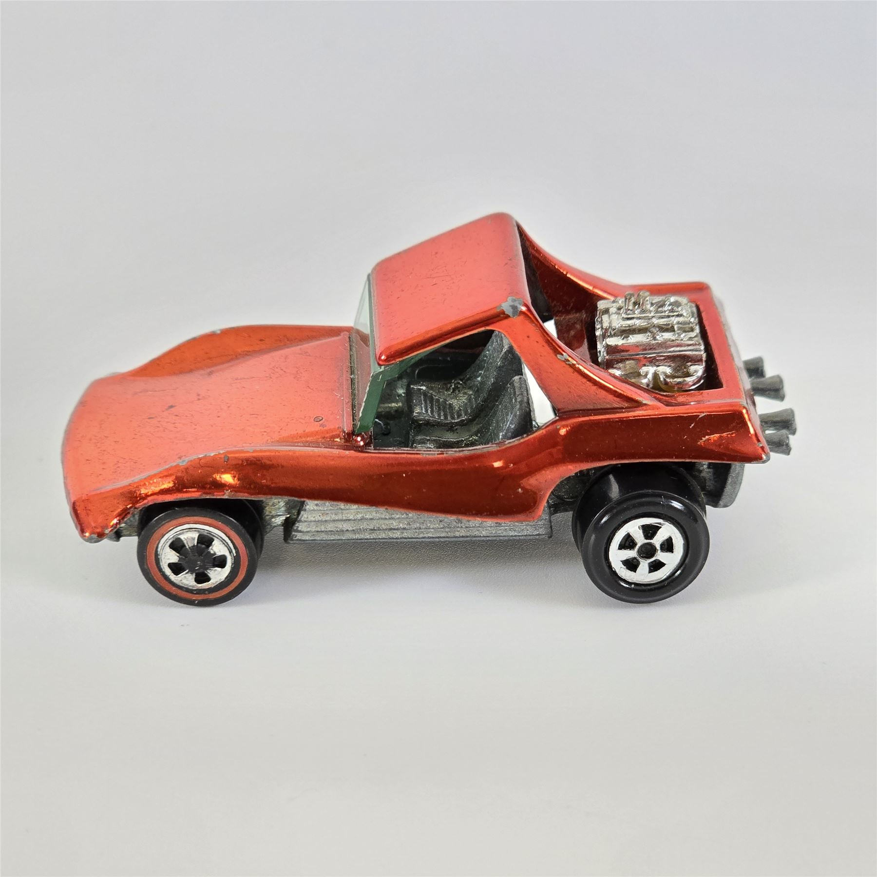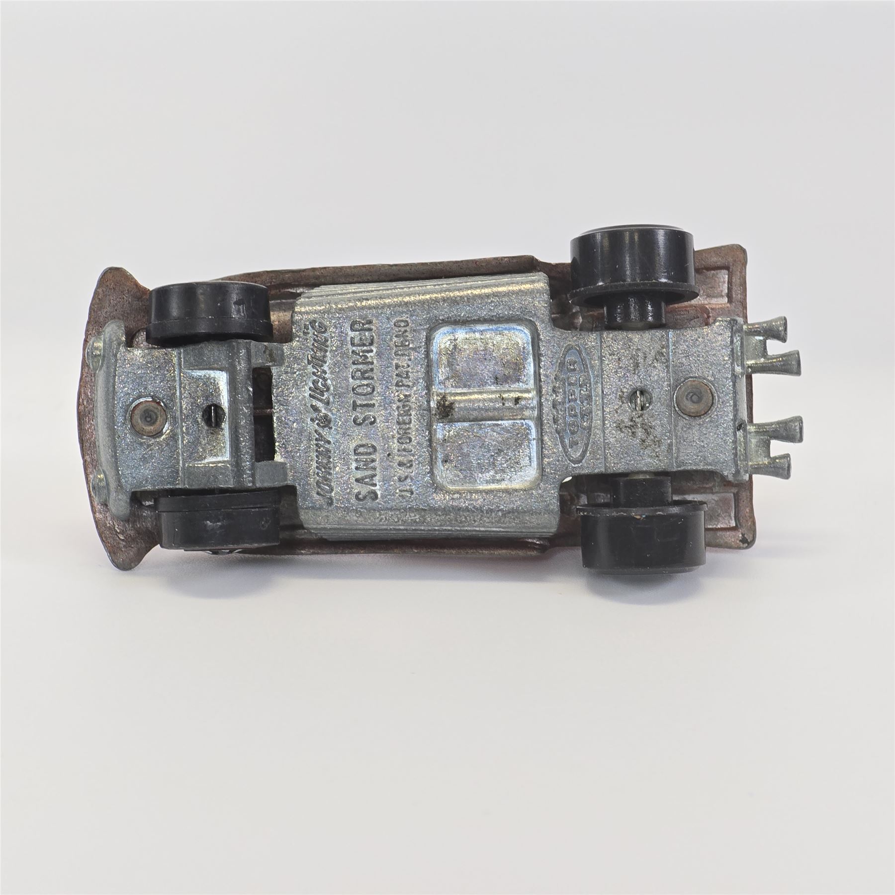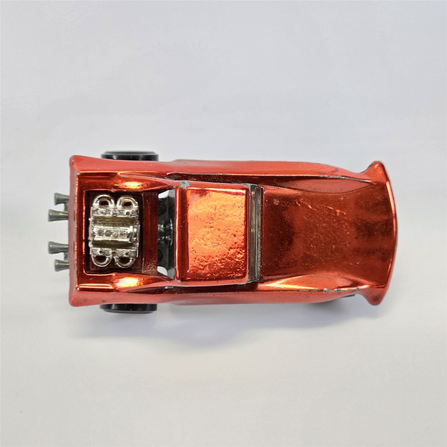 Nice condition overall with some light wear. Has some toning throughout. Glass is crack free. Motor is intact. Wheel chrome is clean. However a repair was made, and front axles were replaced with Hot wheels redline wheels. Base is lightly tarnished.